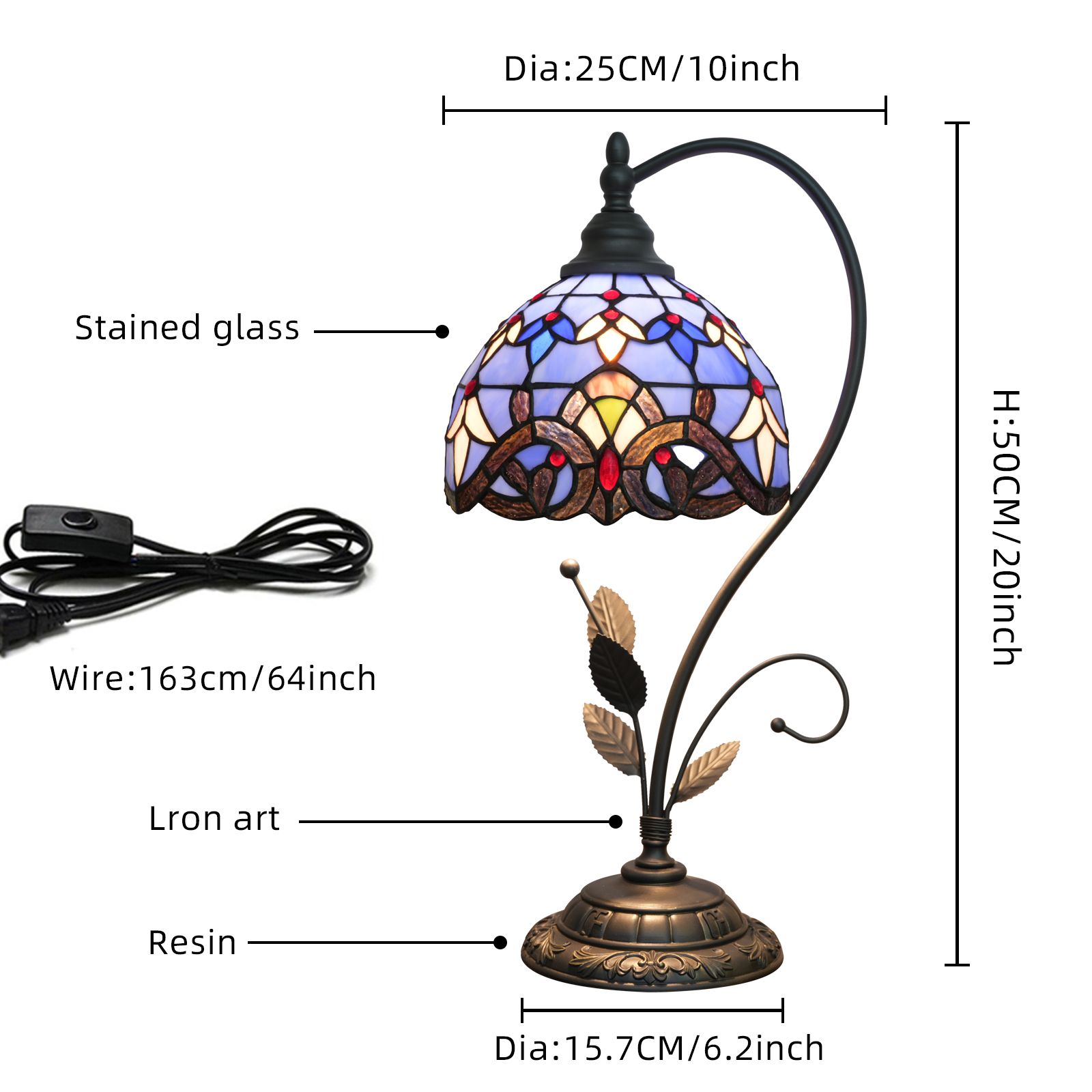 Durability of Materials: The iron frame is rust-proof and corrosion-resistant, the resin base is sturdy and wear-resistant, the colored glass lampshade does not fade or break easily, daily use does not require much maintenance, and it can accompany your home life for a long time;