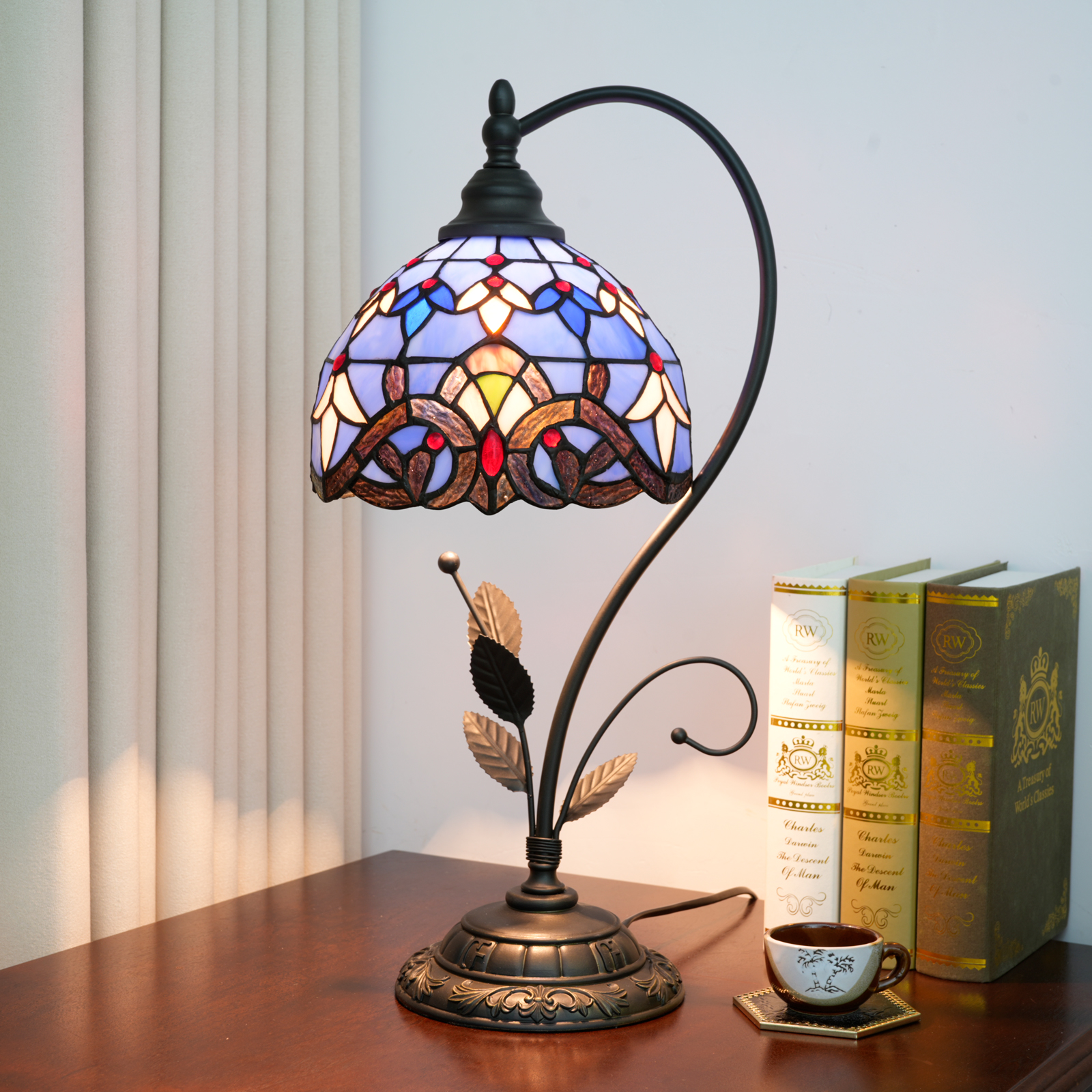 Whether given to friends who love retro art, or as a gift for moving house, wedding, or festivals, this Tiffany retro style colored glass desk lamp is an excellent choice. The exquisite handcrafting, romantic blue Baroque design, and practical lighting function, combined with the beauty level and quality, each gift carries a unique intention, making the recipient feel a warm and surprising feeling.