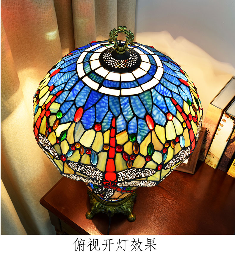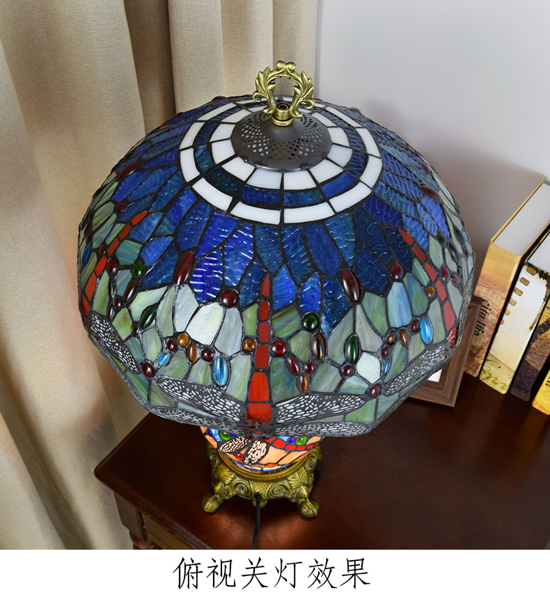 In the lamp base, a larger dragonfly is perched on it, with its wings mainly in cobalt blue glass, dotted with golden and red spots, like the most dazzling spirit in summer. It echoes the dragonflies on the main lampshade, forming a "mother and daughter companion" visual effect, which enriches the layers and gives the lamp a unique emotional connotation - as if it is the gentle whisper of nature, reminding us to look up and appreciate the beauty around us in the busy life.