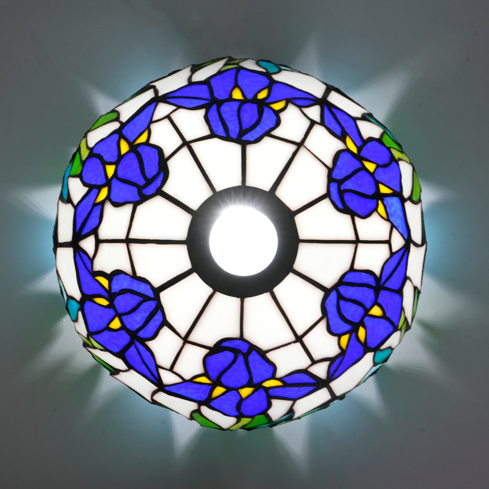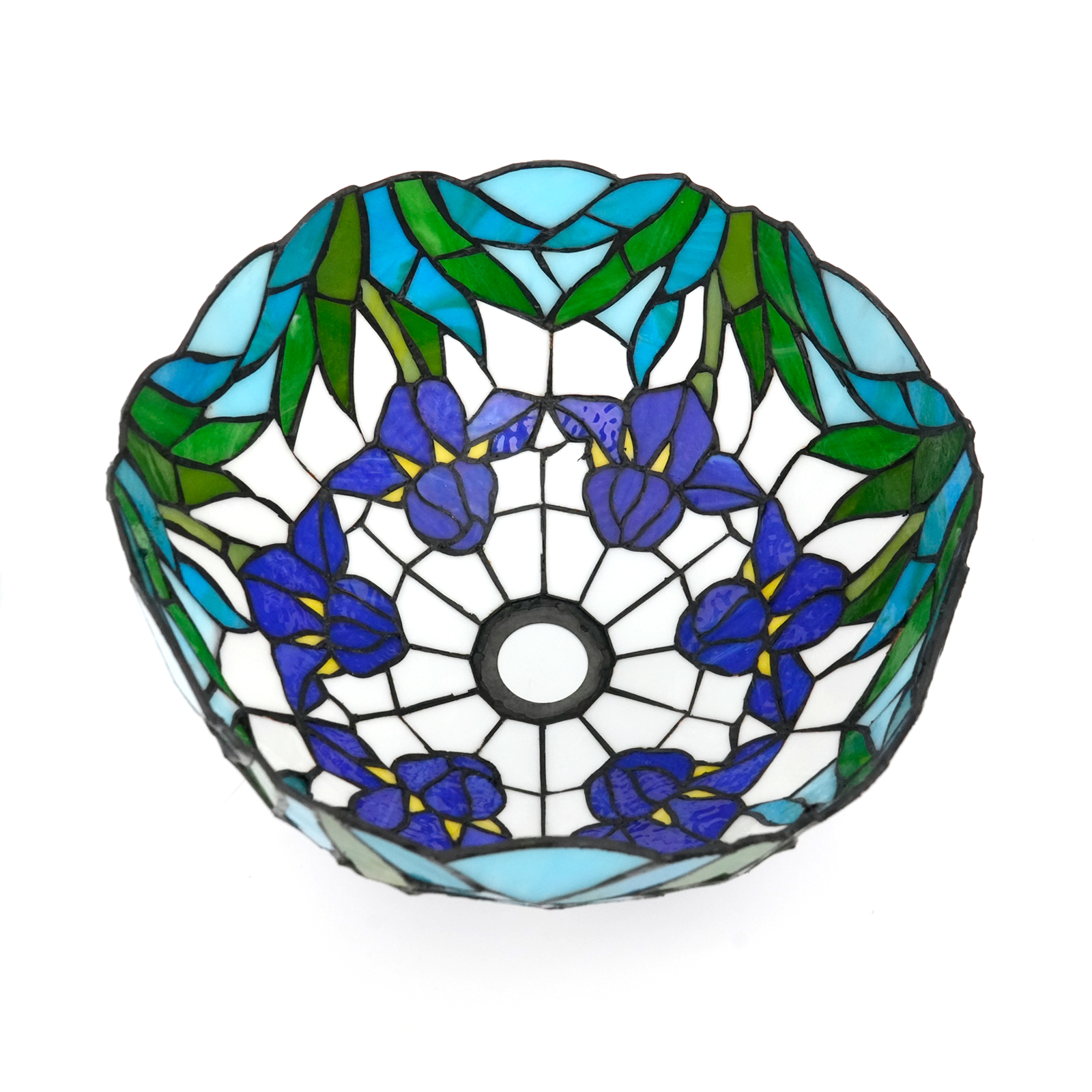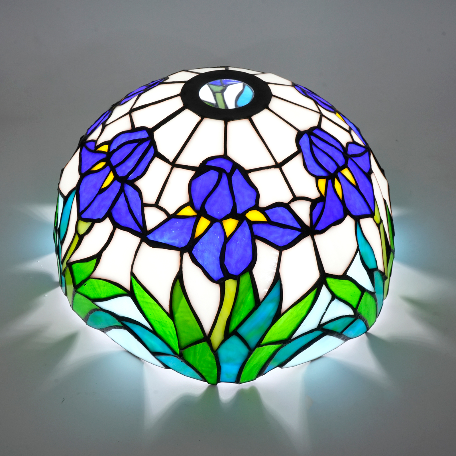 Inheriting the classic Tiffany soldering technique, the artisans were inspired by six irises to precisely cut and assemble the stained glass. Each piece of glass is polished, coated with copper foil (made of brass with adhesive for easy bonding), and then welded piece by piece to perfectly present the elegant shape and brilliant colors of the iris. With a diameter of 12 inches (approximately 30CM) and a height of 16CM, the semi-circular dome Outlines a romantic profile. The 4.2CM large hole precisely fits the floor lamp and chandelier. The handcrafted warmth endows the work with a unique artistic soul.
