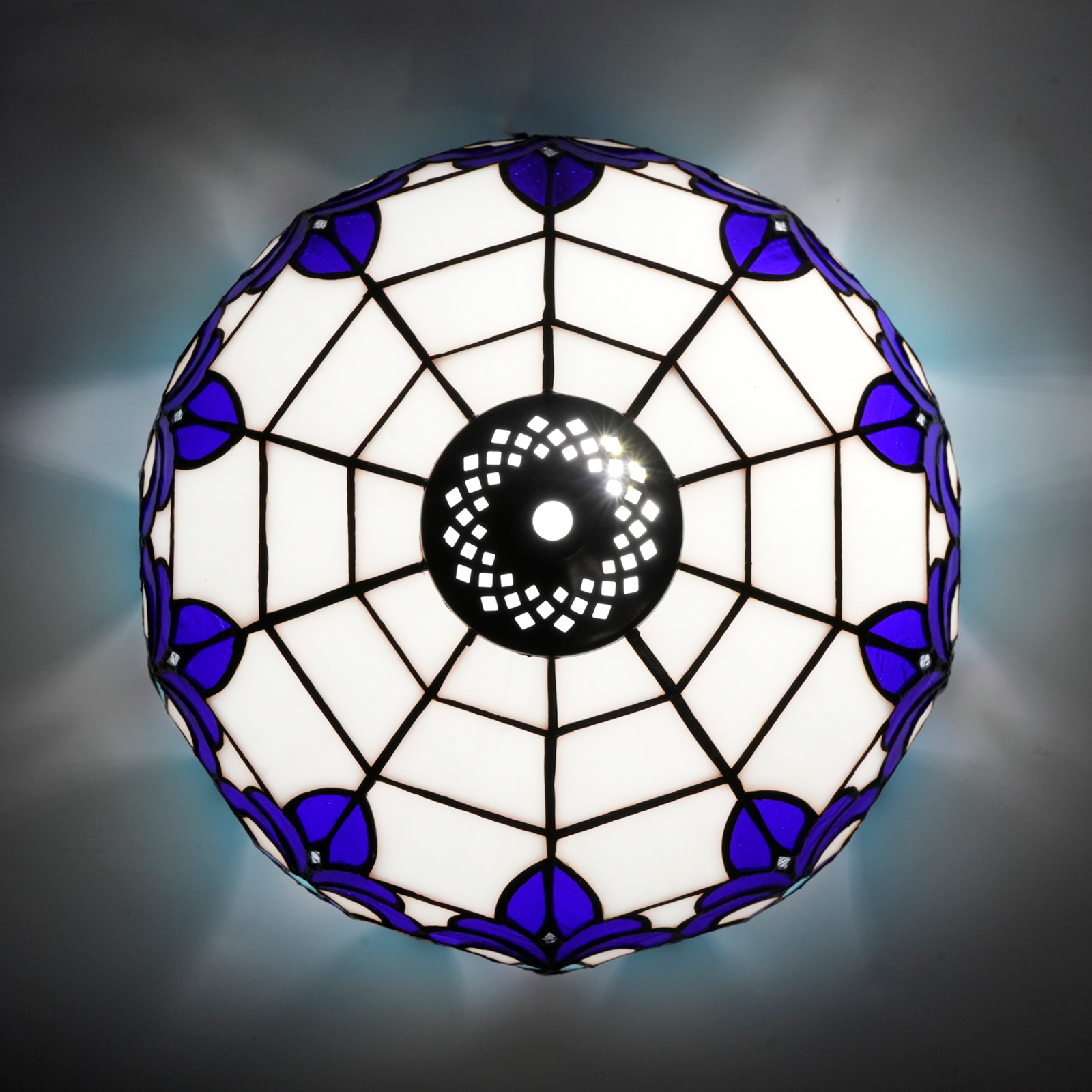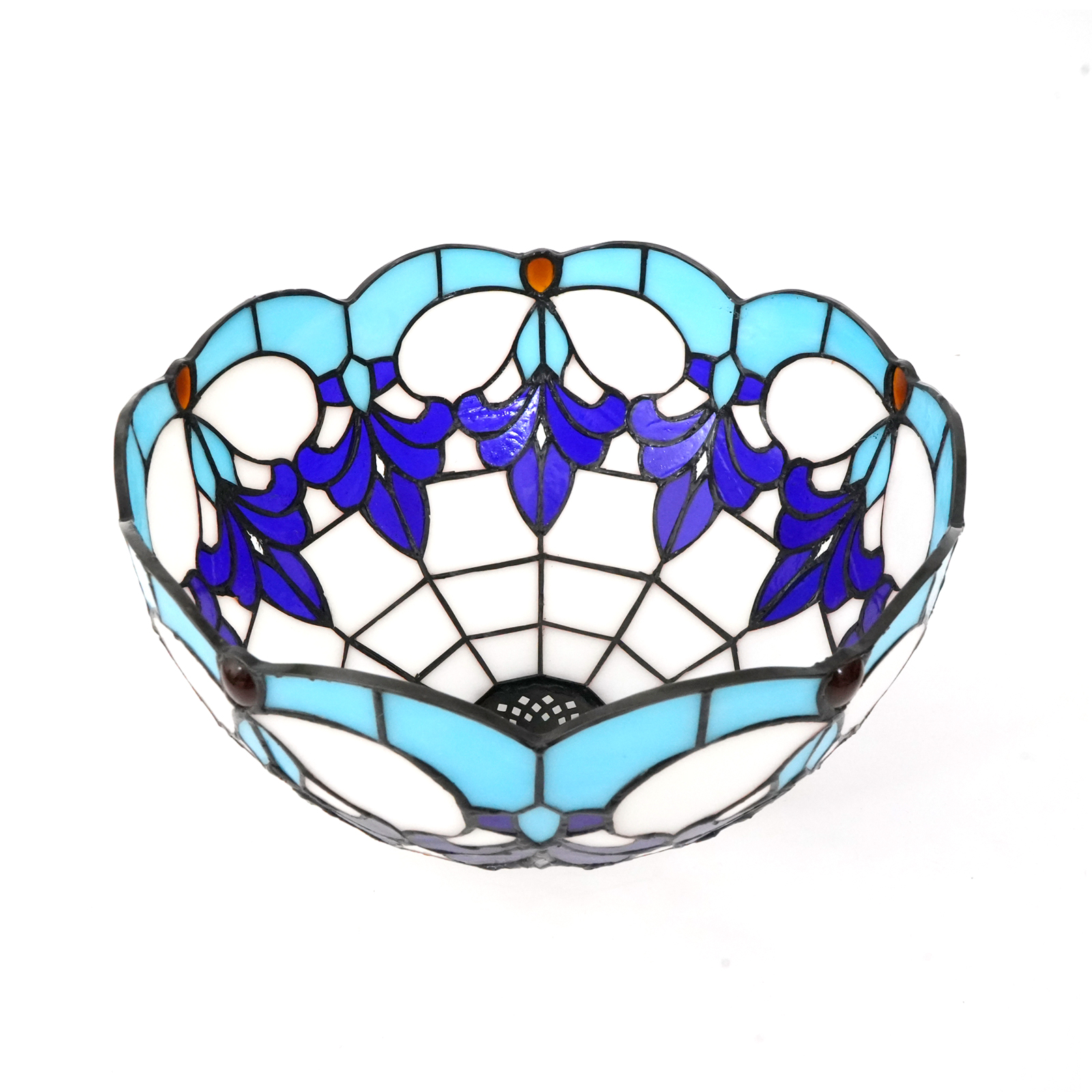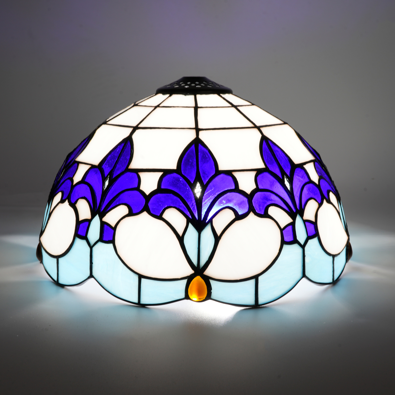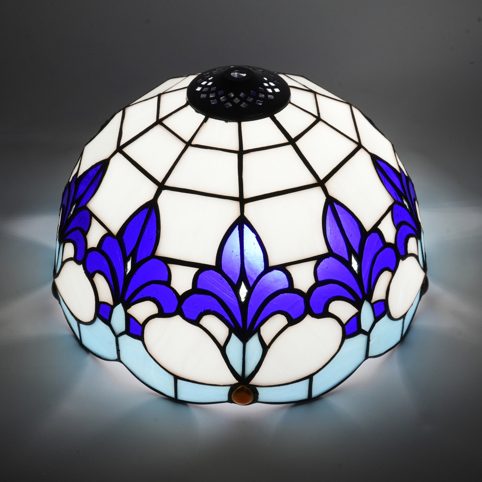 Inheriting the classic Tiffany soldering technique, the artisans meticulously cut and polish the stained glass. Each piece of glass is wrapped with brass foil (about 0.2mm thick and 4-6mm wide, firmly bonded with glue), and then welded with tin wire, allowing 10 blue irises to elegantly bloom on the lampshade. With a diameter of 12 inches (approximately 30CM) and a height of 18CM, the semi-circular dome is hand-assembled to create a unique tension. The small holes are precisely fitted to table lamps, floor lamps, and chandeliers. Each one embodies the warmth of handcrafting, making it a one-of-ar-kind artistic piece.