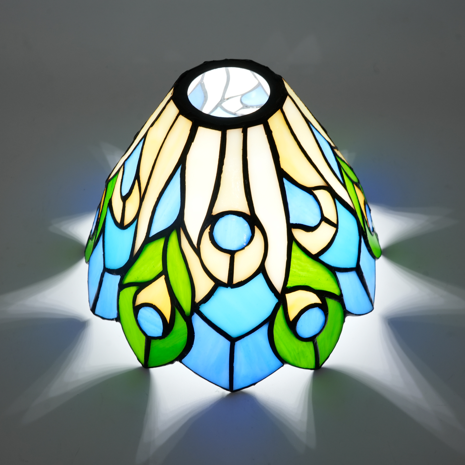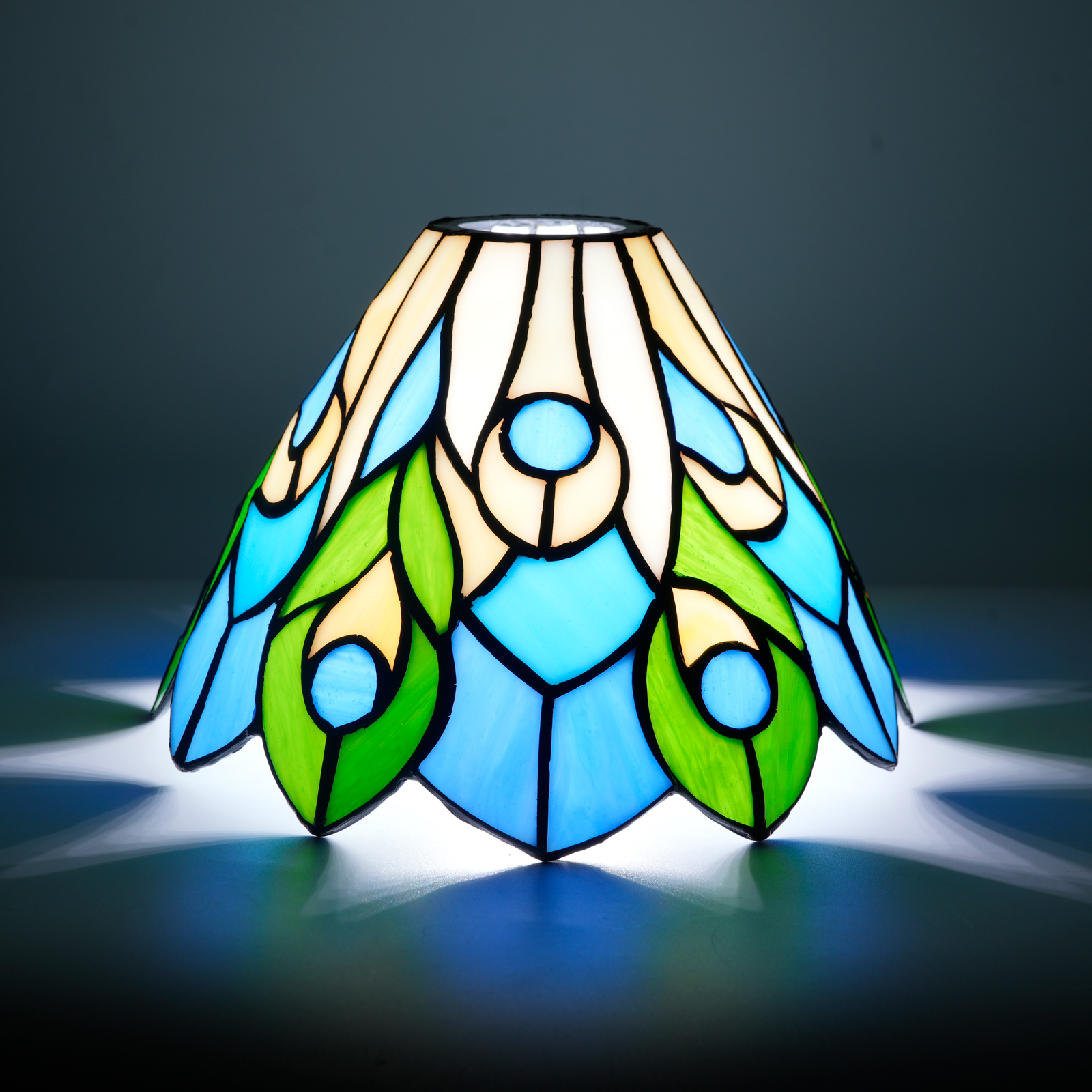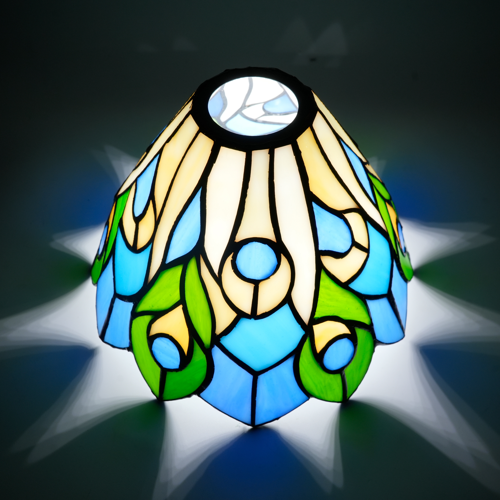 Inheriting the classic Tiffany craftsmanship, each piece of colored glass is carefully selected and cut, and then meticulously pieced together by skilled artisans. The 8-inch lampshade presents a pattern as brilliant as the tail feathers of a peacock. The blue and green interwoven feathers are paired with dynamic dots, creating a colorful and layered look. The exquisite metal frame Outlines the shape, making the entire lampshade look like a beautiful work of art and endowing the lamp with a unique soul.