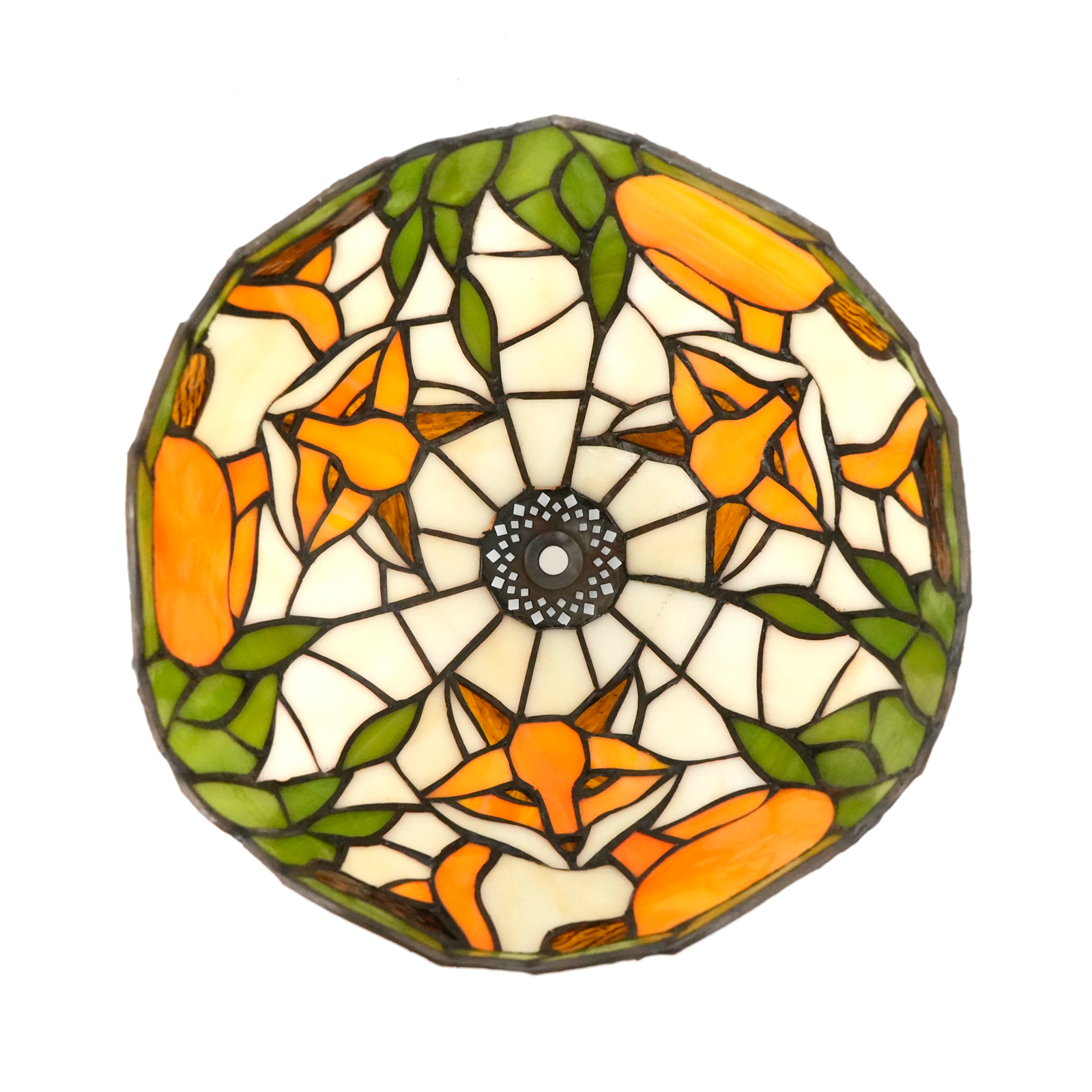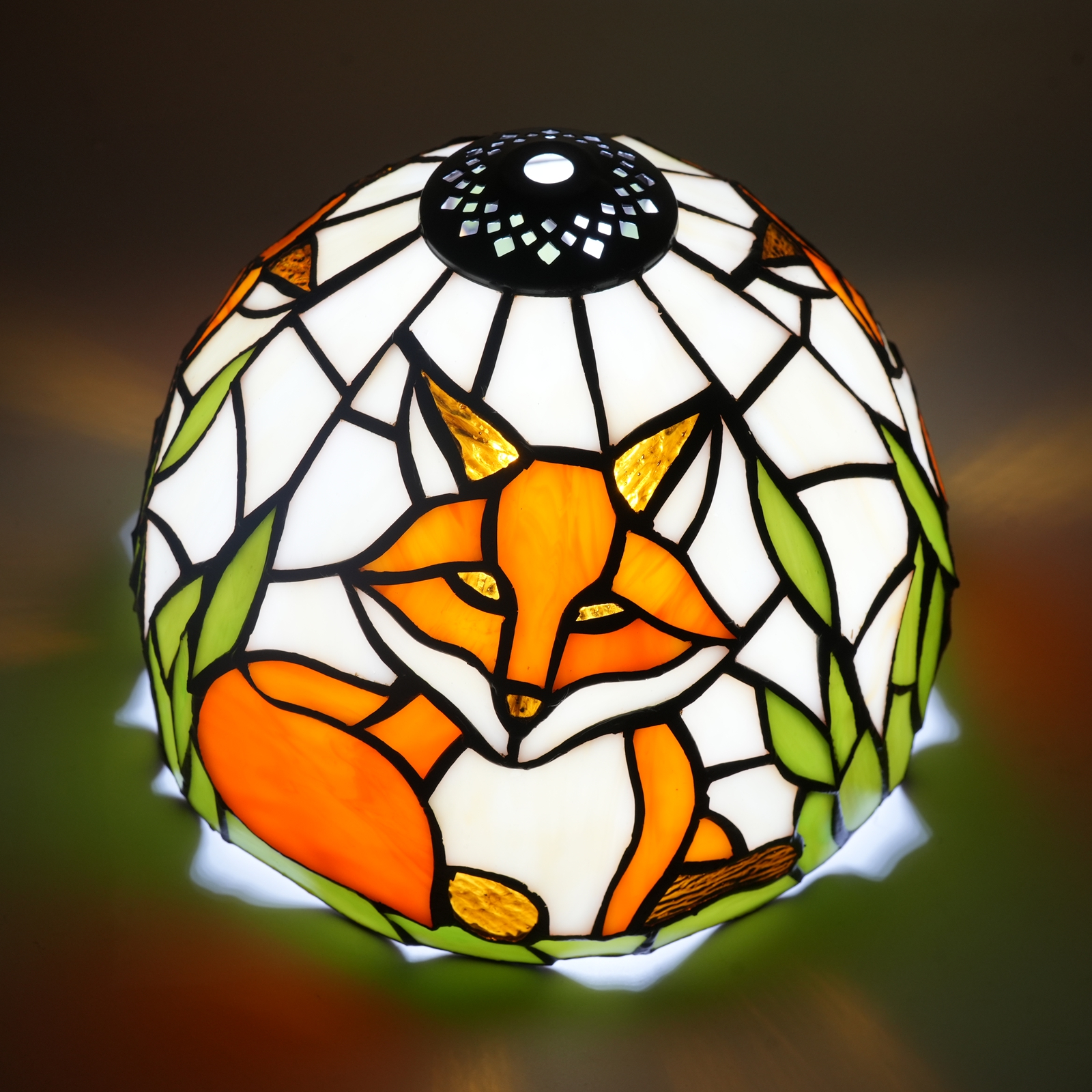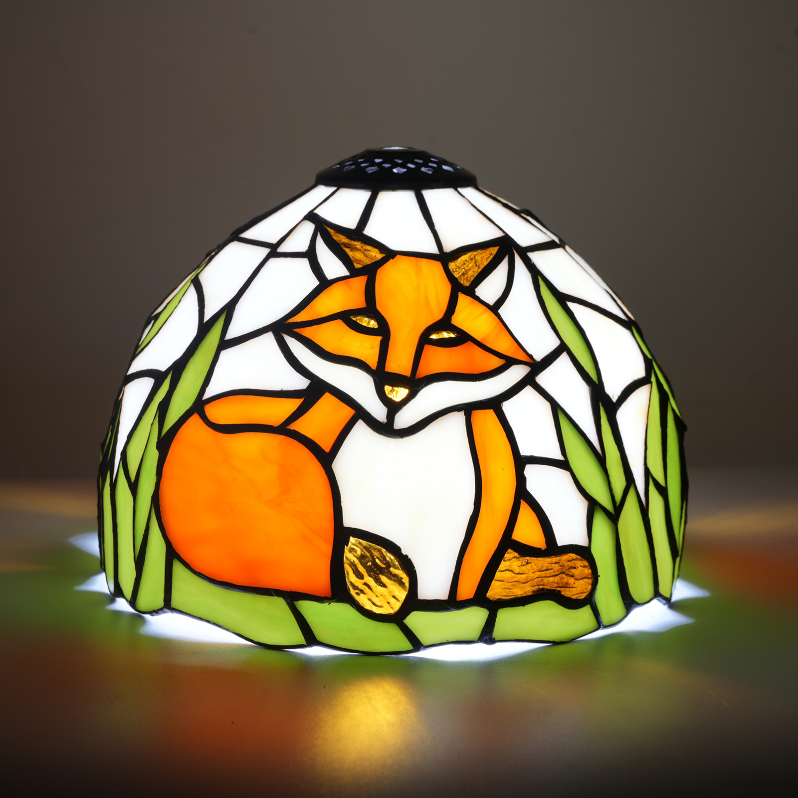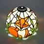 The main body of the lampshade depicts a little orange fox curled up and resting. The fox's orange and white fur colors are perfectly presented through glass of different colors, looking vivid and lifelike. Surrounded by emerald green grass leaves, the colors contrast sharply, creating a natural and harmonious atmosphere. It seems as if a scene in the forest has been frozen on the lampshade, bringing people a dynamic visual enjoyment.