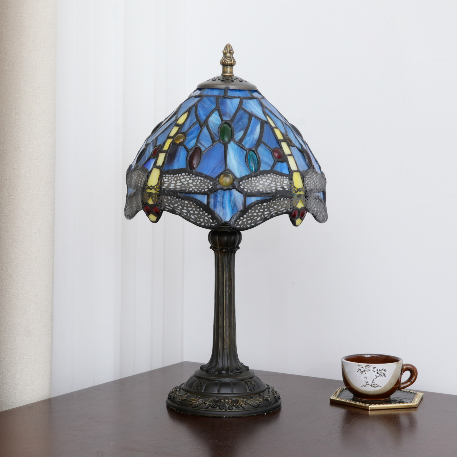 8-Inch Blivuself Tiffany Style Stained Table Lamp, Retro-Style Dragonfly Pattern Design Bedside Lamp, Suitable For Home Decoration In Bedrooms, Dining Rooms, Living Rooms, Etc. (OFU1221, 449 Blue Background Dragonfly)