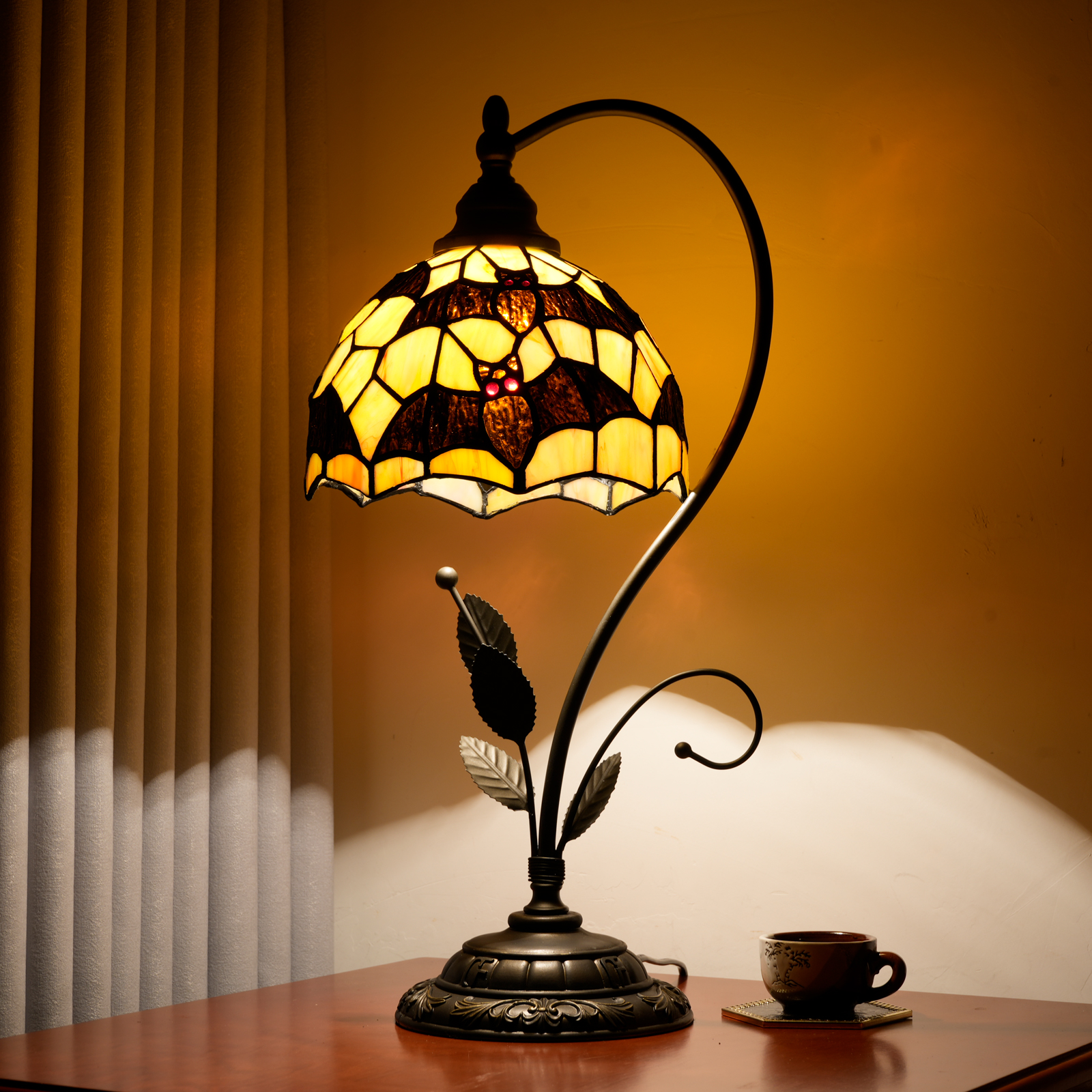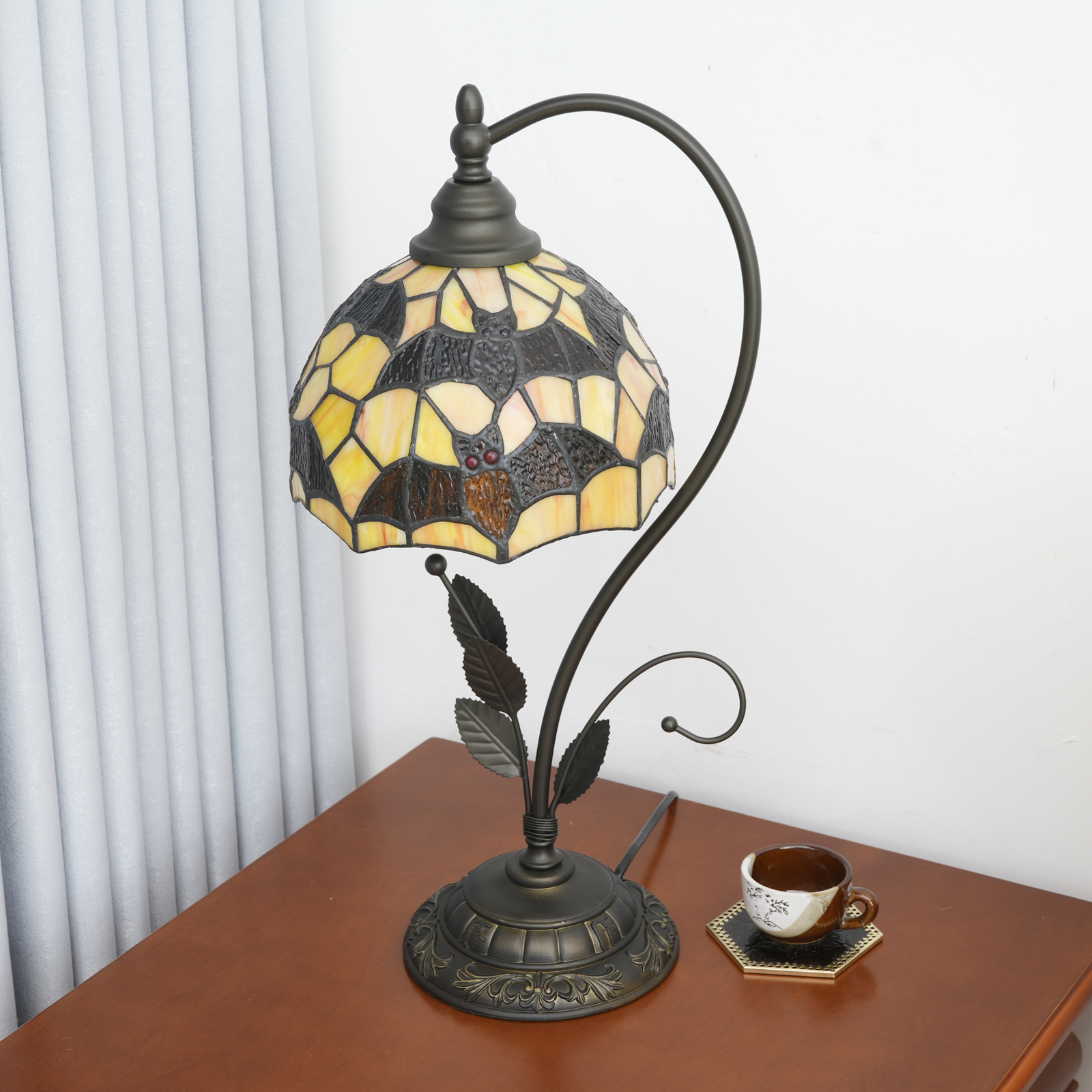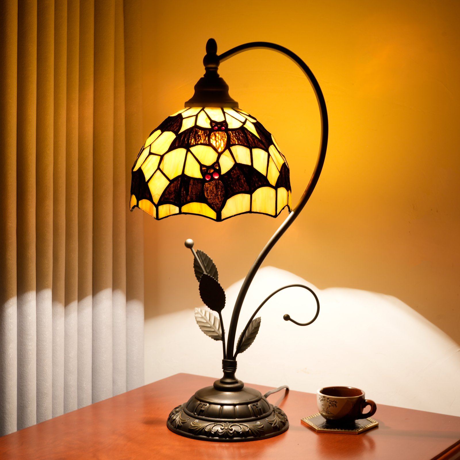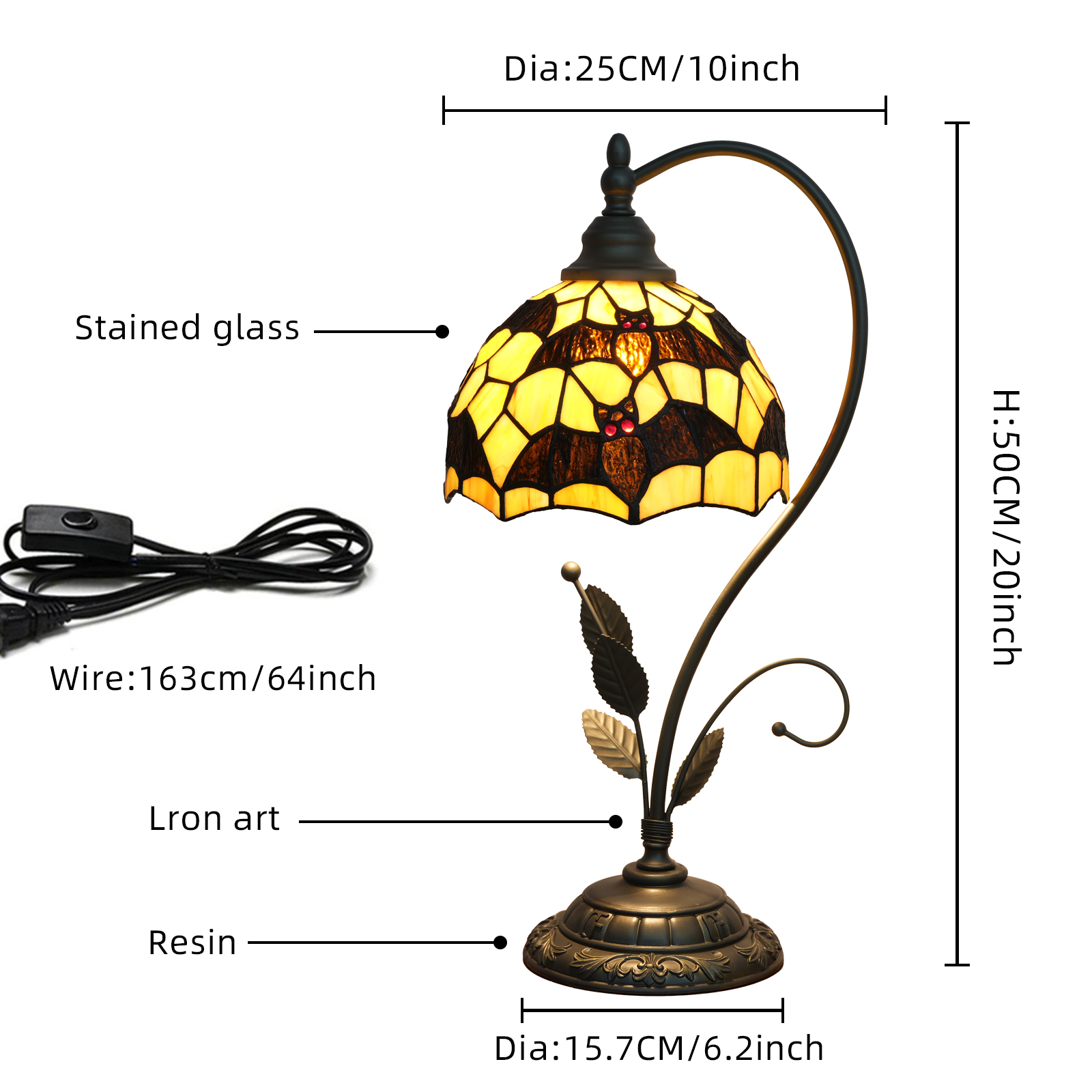 Lampshade: use stained glass, diameter 25CM yellow bottom with black bat pattern, rich color and rich artistic sense, good light transmittance, can downy light.Lamp body: S-shaped iron stand, decorated with leaf-shaped ornaments, featuring elegant and smooth lines, combining retro style with vitality. The base is made of resin, with a diameter of 15.7CM, exquisitely carved with patterns, which is stable and enhances the overall texture.