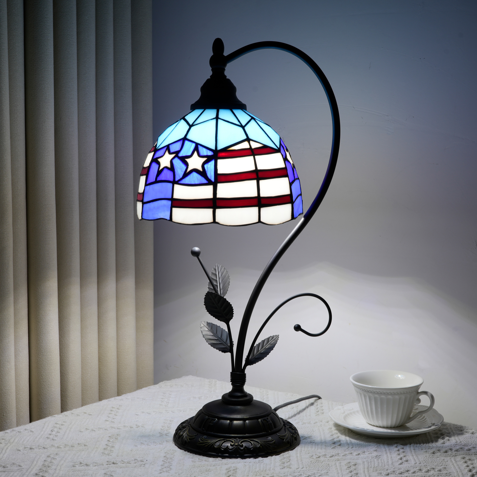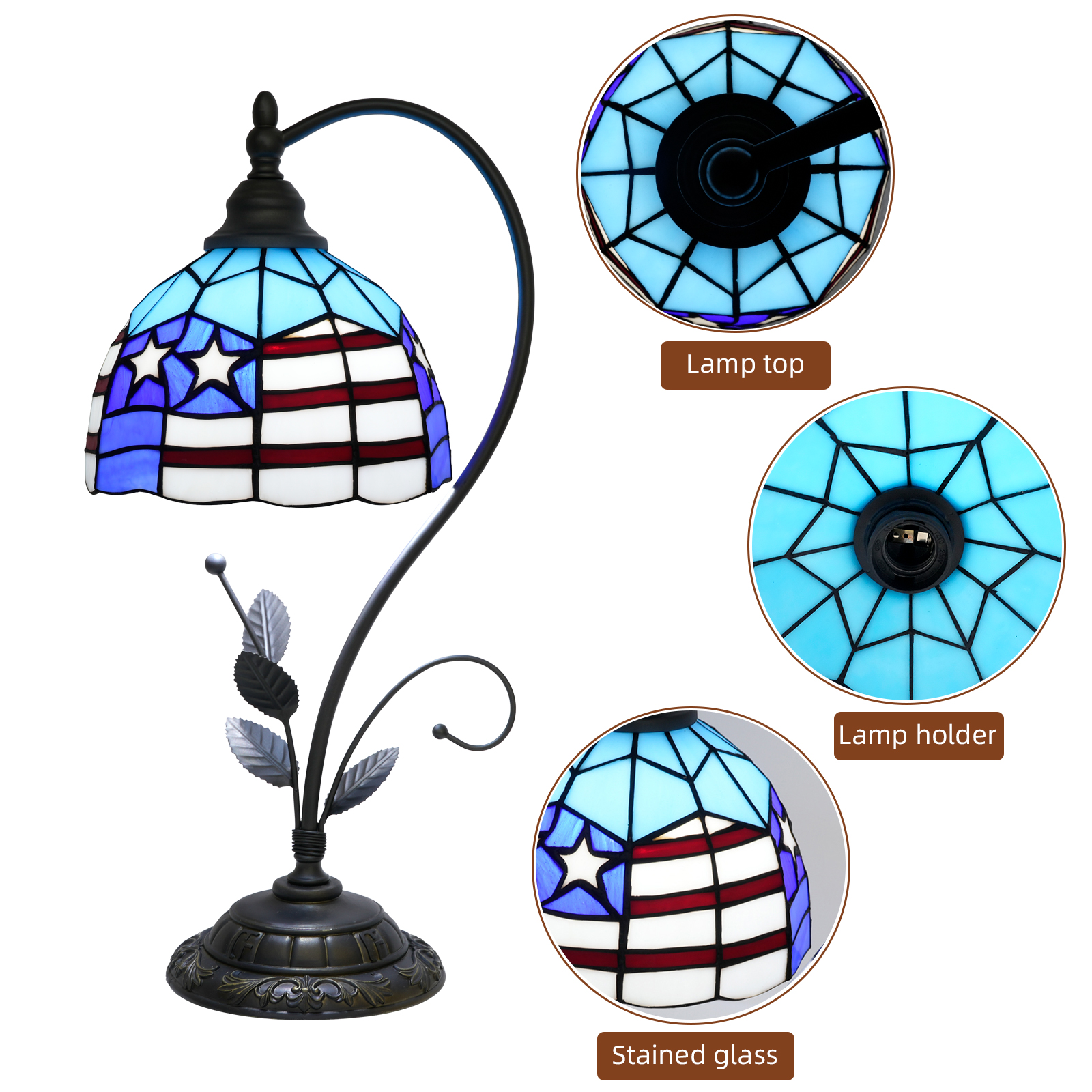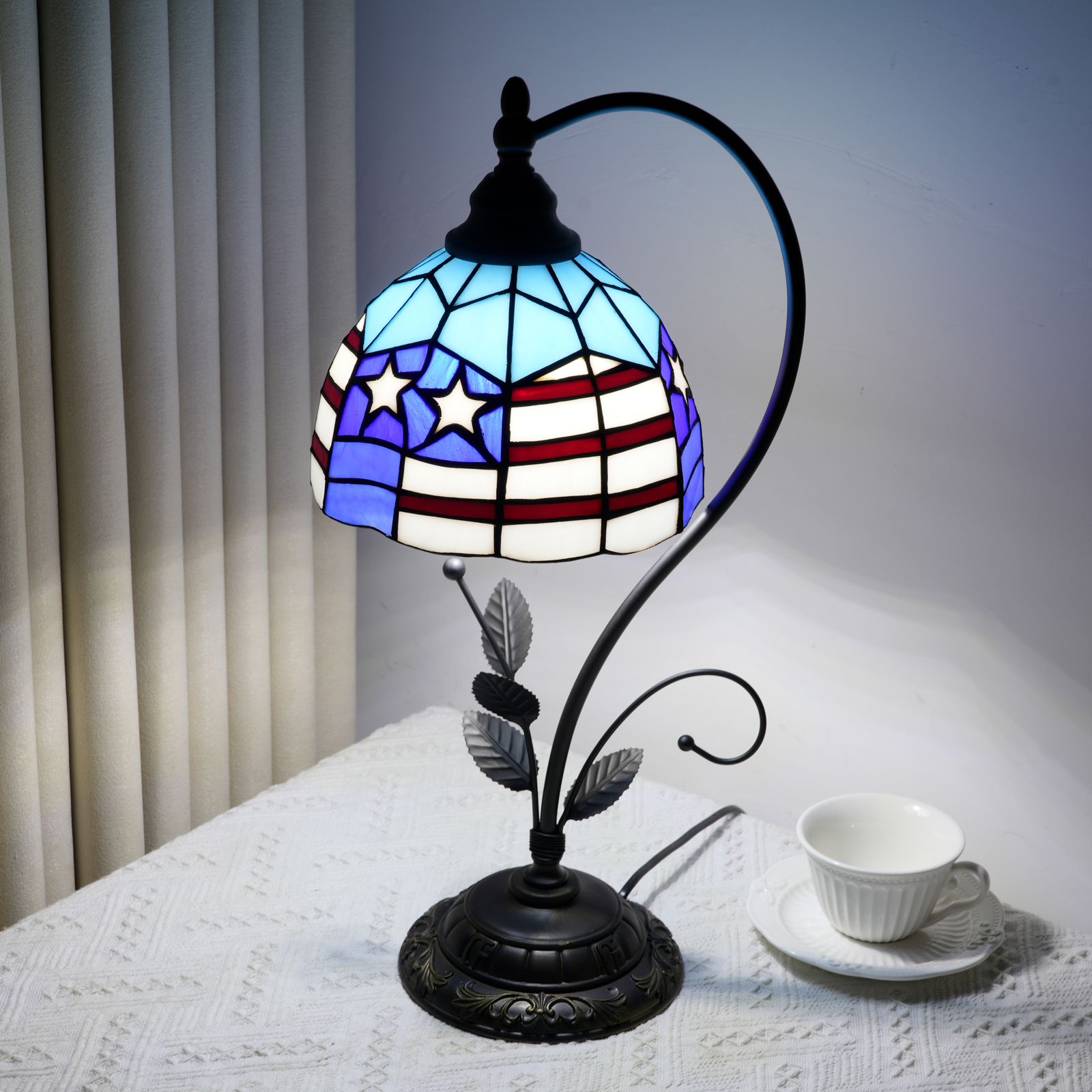 The lampshade is made of colored Stained glass (Stained glass), with blue as the main color, complemented by white stars and red and white stripes, presenting a visual effect similar to the national flag, highly recognizable. Each piece of glass has been meticulously cut and pieced together. Under the illumination of lights, it emits a colorful and soft glow, creating a warm and romantic atmosphere.
