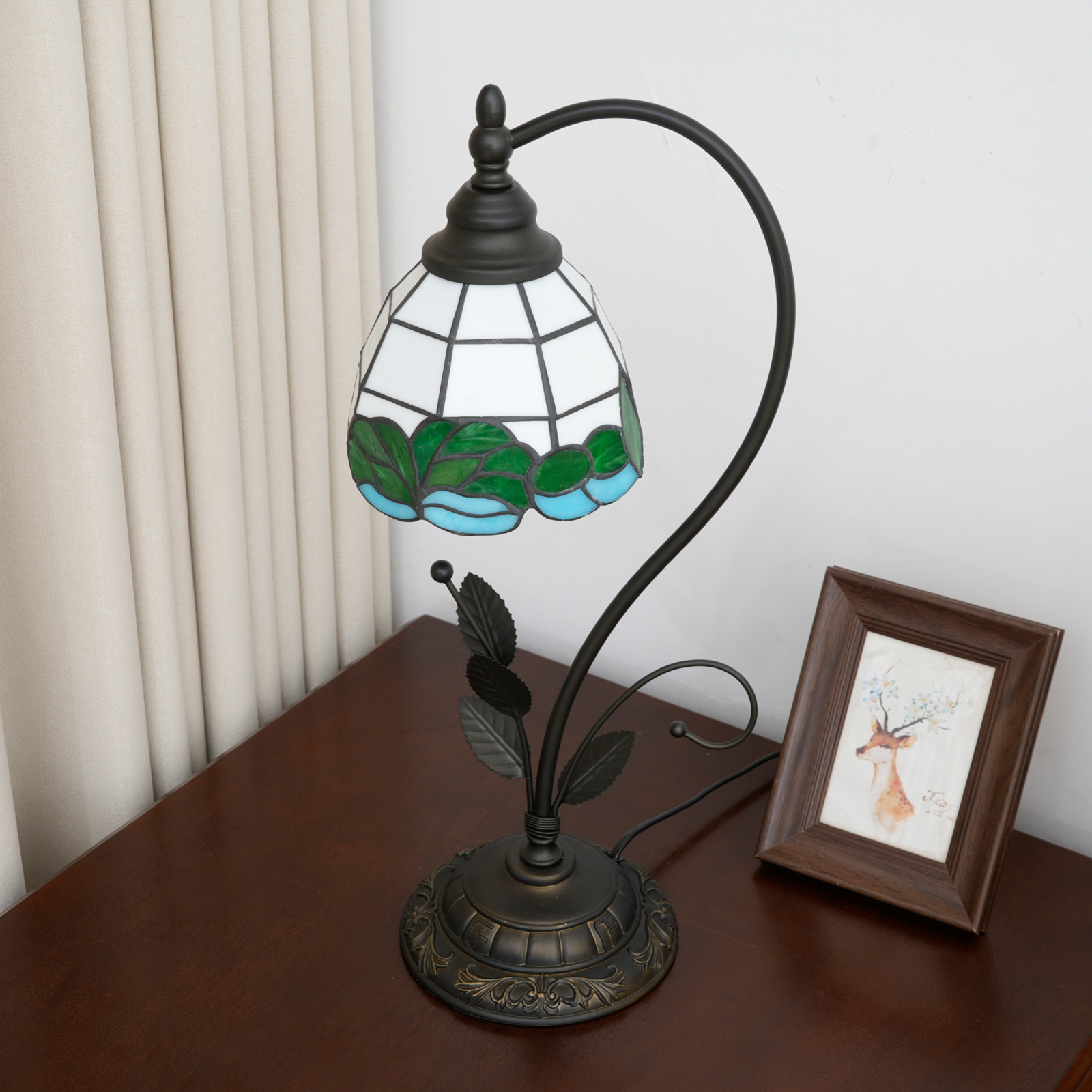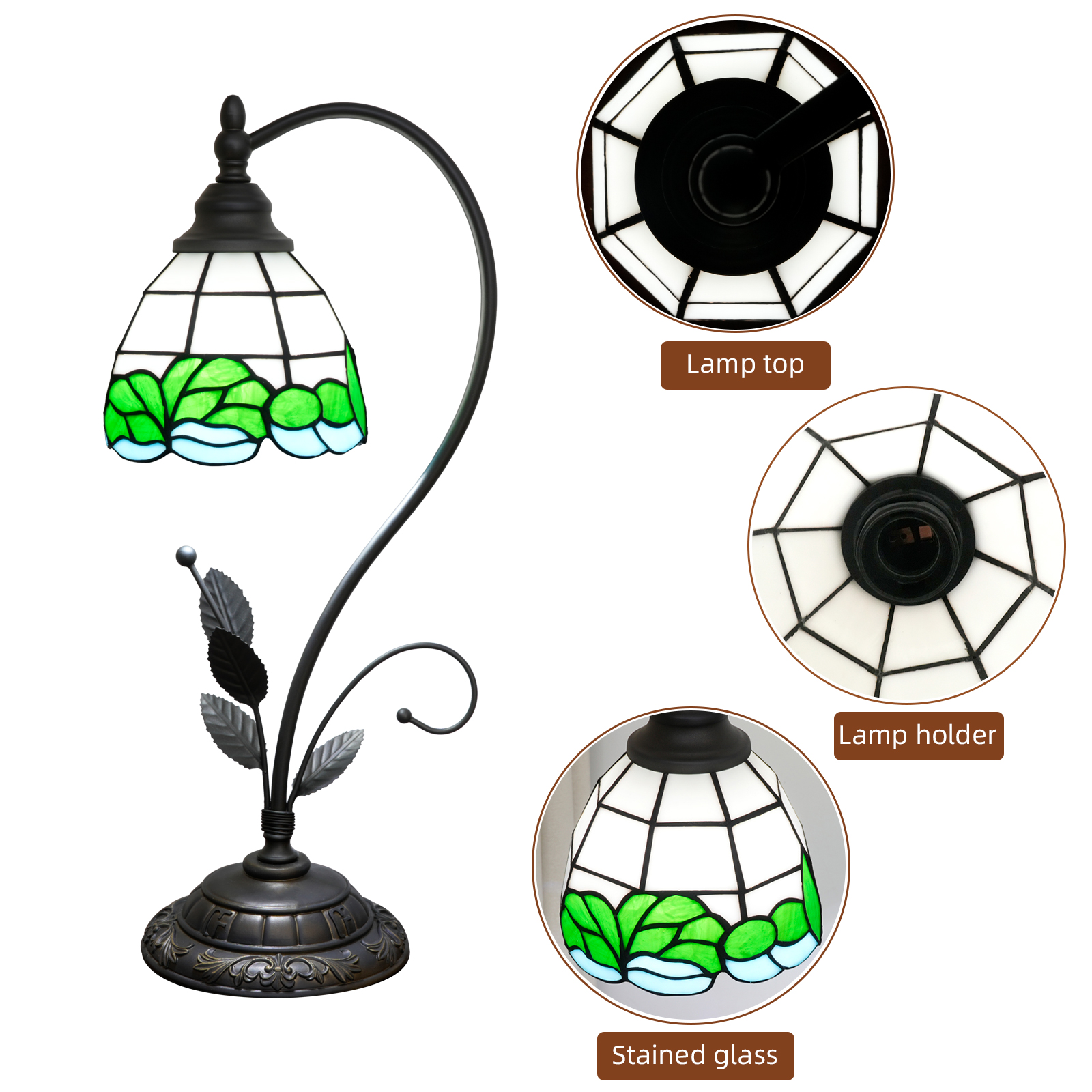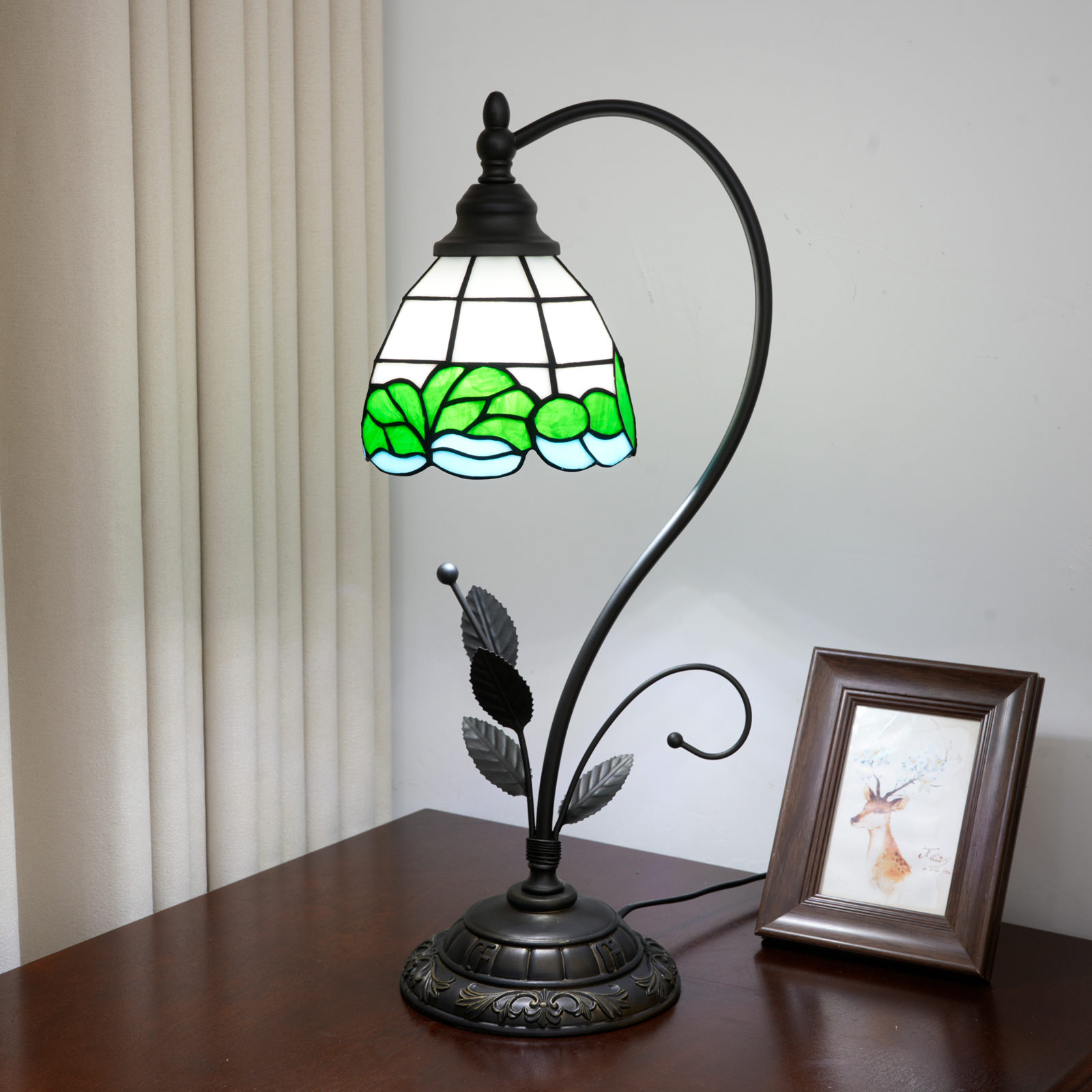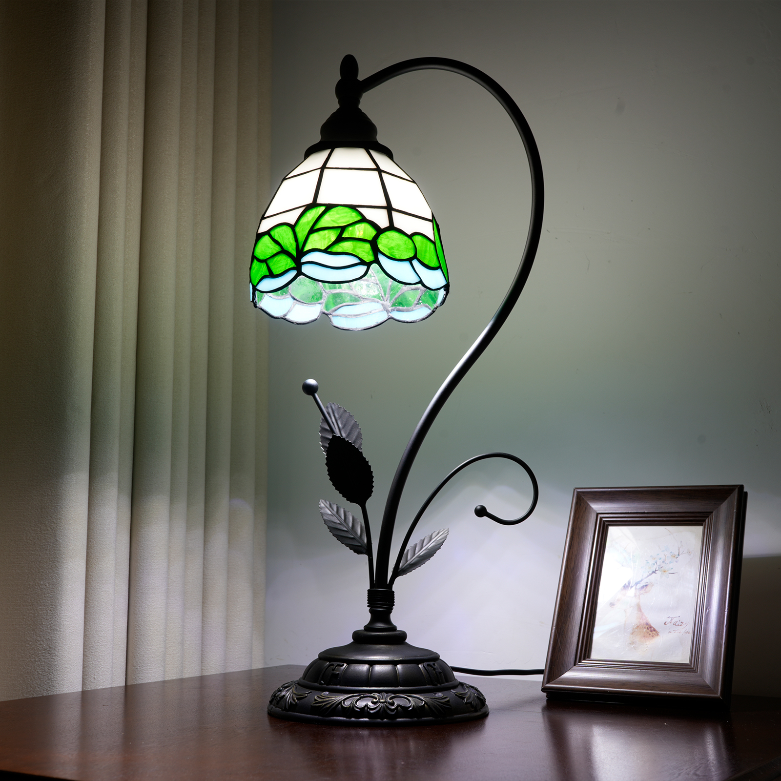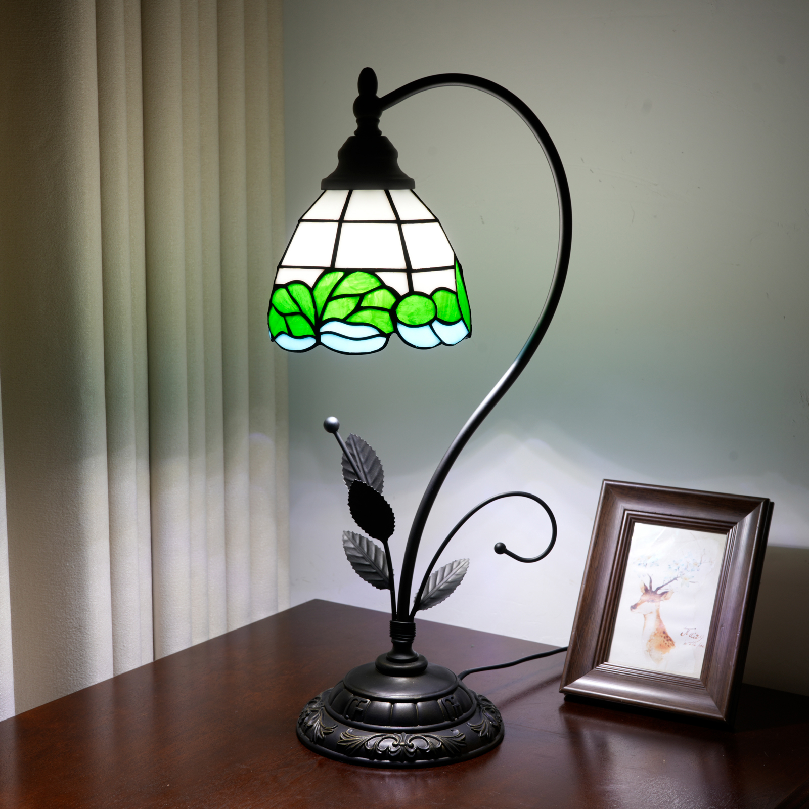 This "Green Lotus Leaf" colored glass table lamp features emerald green lotus leaves on a white base crafted by hand. The edges are light blue like the water ripples by the pond. Each piece of glass is cut and spliced repeatedly polished by the artisan. Under the light, the texture of the lotus leaves is as vivid as the pond leaves dotted with morning dew. The retro aged ironwork curved arms are entwined around three-dimensional branches and leaves, like vines growing out of the texture of a lotus pond. Every bend conceals the retro warmth of handforging. Paired with a resin base decorated with European-style carvings, it exudes a sense of classical refinement in its weightiness. The overall design firmly combines the freshness of the lotus pond with the retro aesthetic.