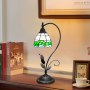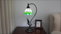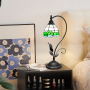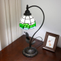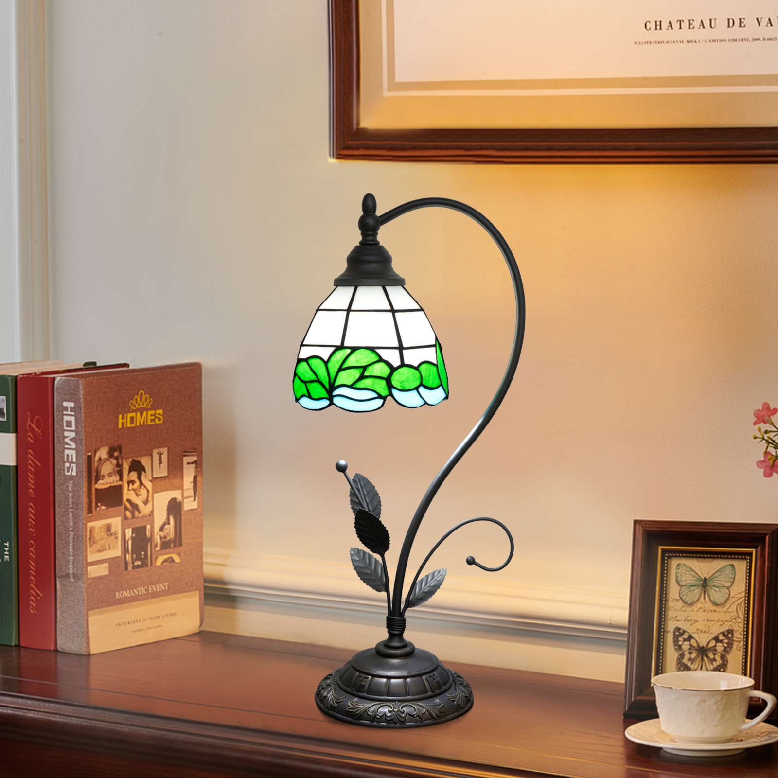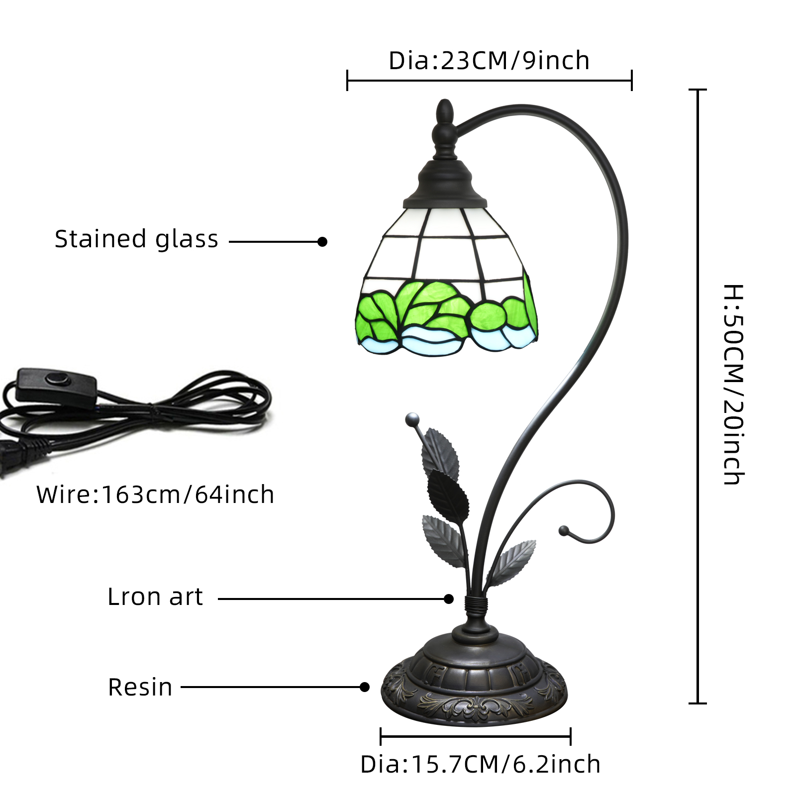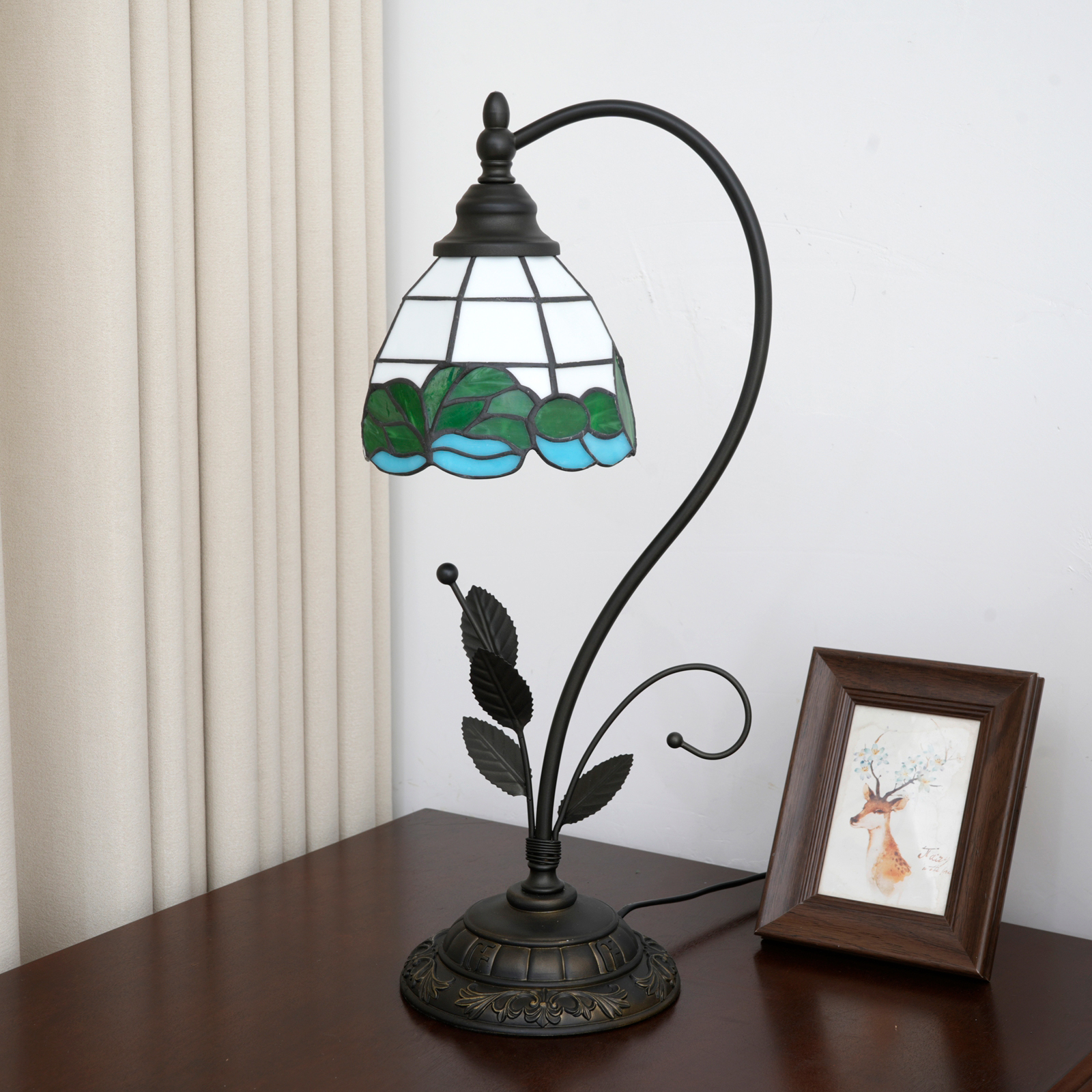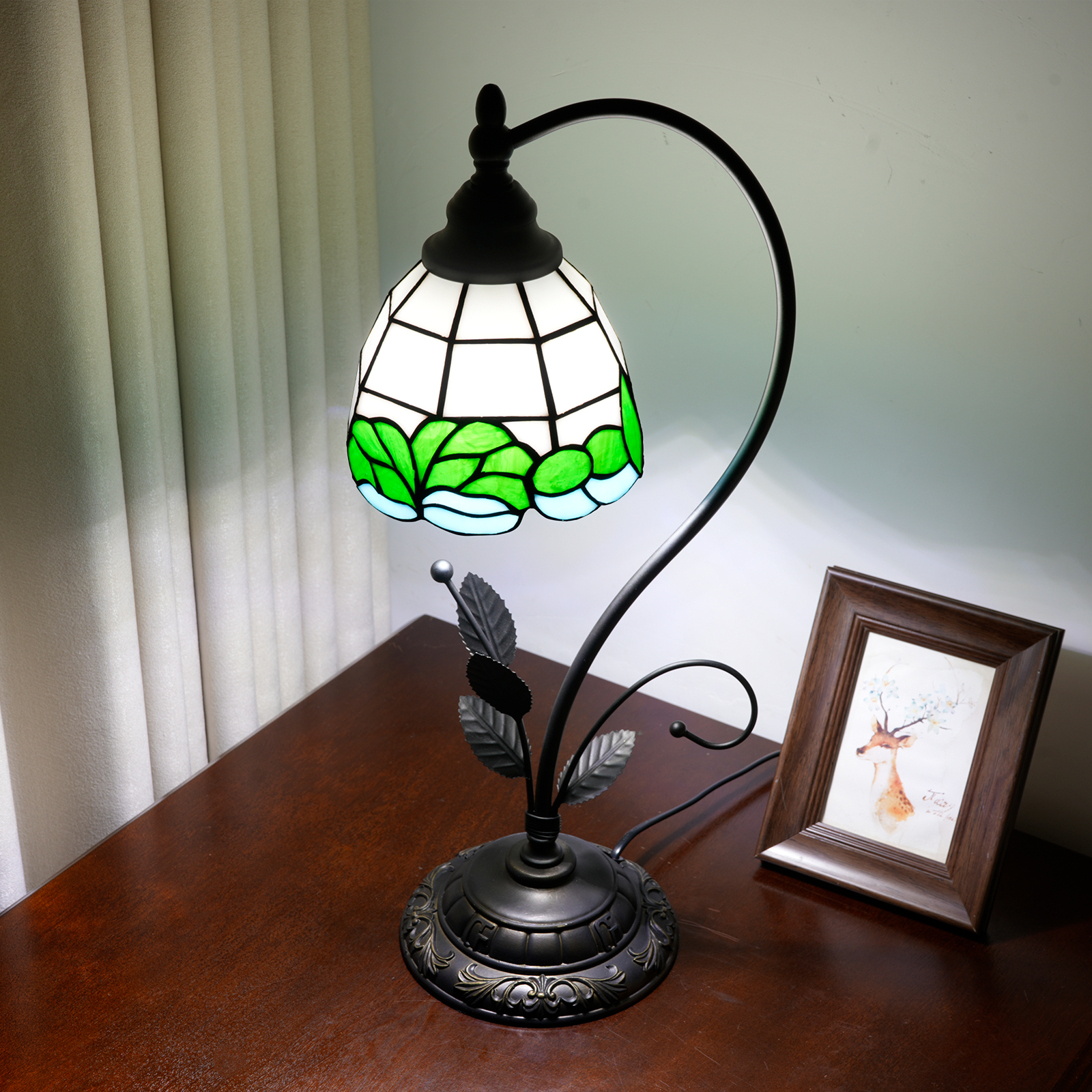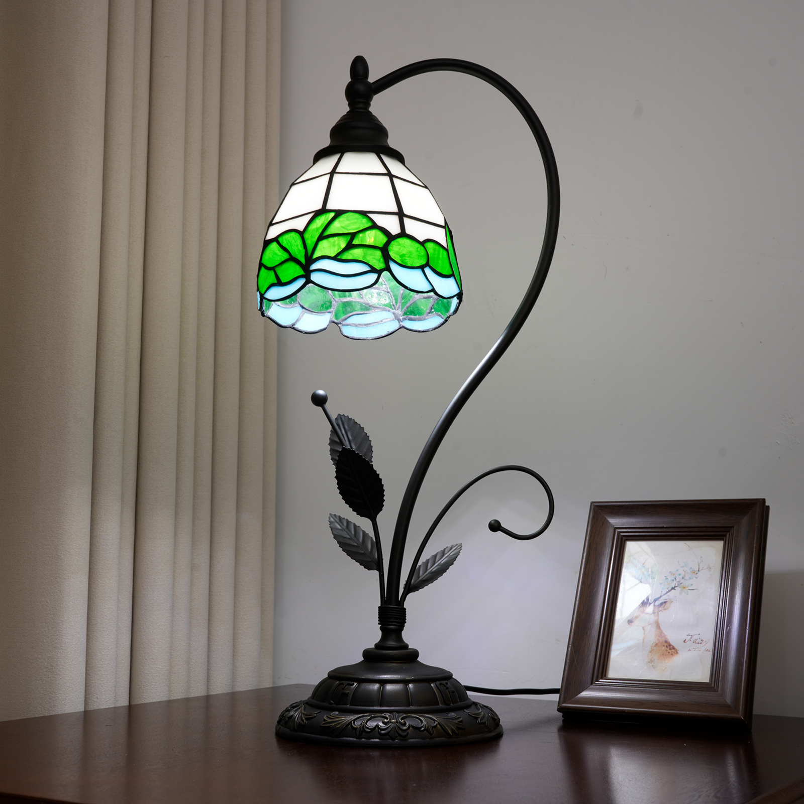 This "Green Lotus Leaf" colored glass table lamp features emerald green lotus leaves on a white base crafted by hand. The edges are light blue like the water ripples by the pond. Each piece of glass is cut and spliced repeatedly polished by the artisan. Under the light, the texture of the lotus leaves is as vivid as the pond leaves dotted with morning dew. The retro aged ironwork curved arms are entwined around three-dimensional branches and leaves, like vines growing out of the texture of a lotus pond. Every bend conceals the retro warmth of handforging. Paired with a resin base decorated with European-style carvings, it exudes a sense of classical refinement in its weightiness. The overall design firmly combines the freshness of the lotus pond with the retro aesthetic.