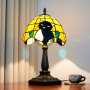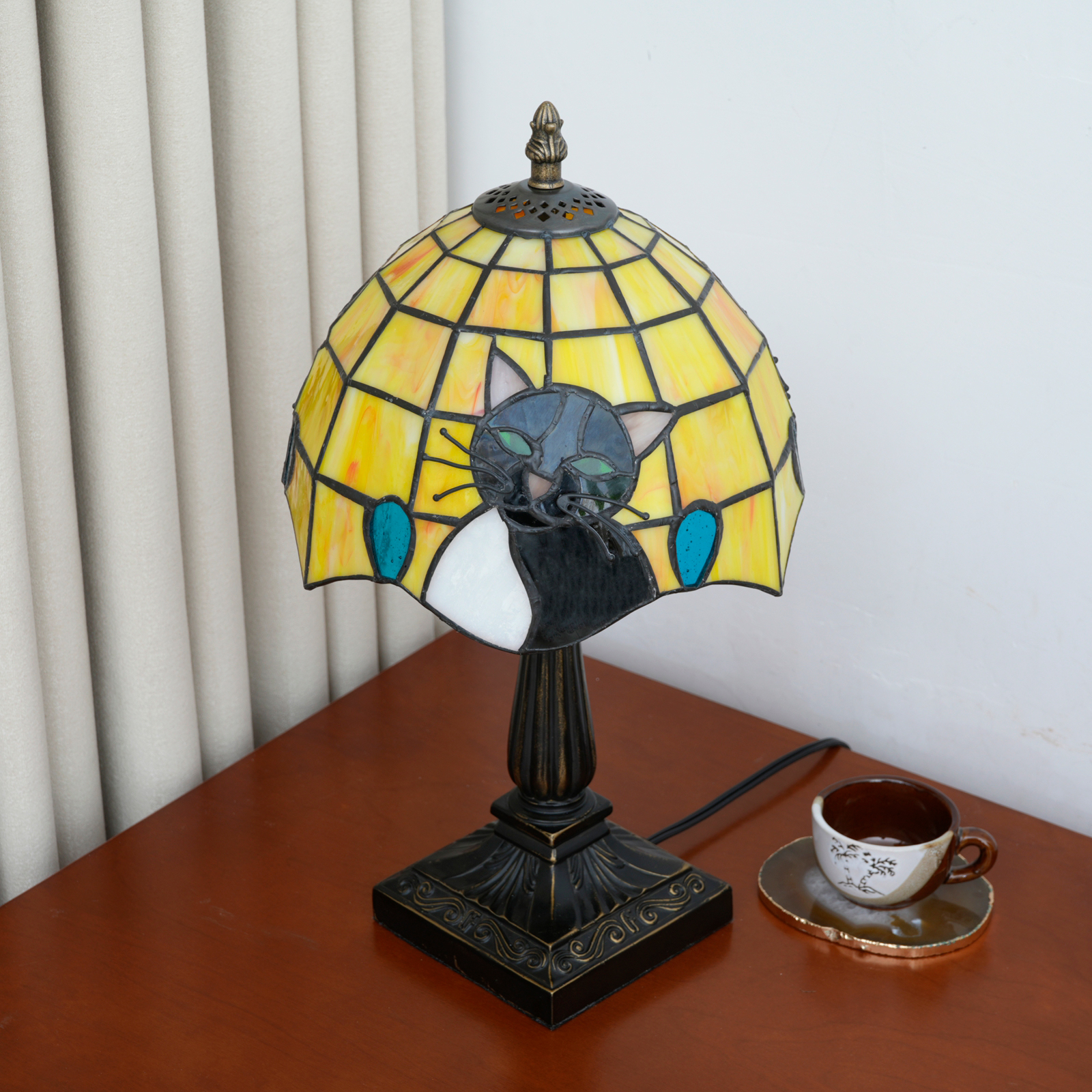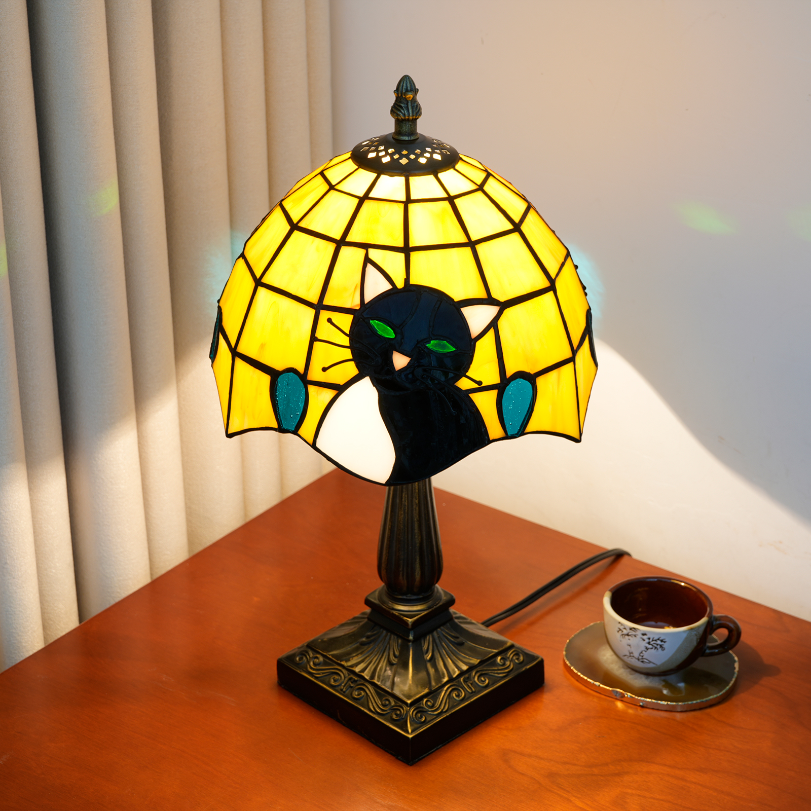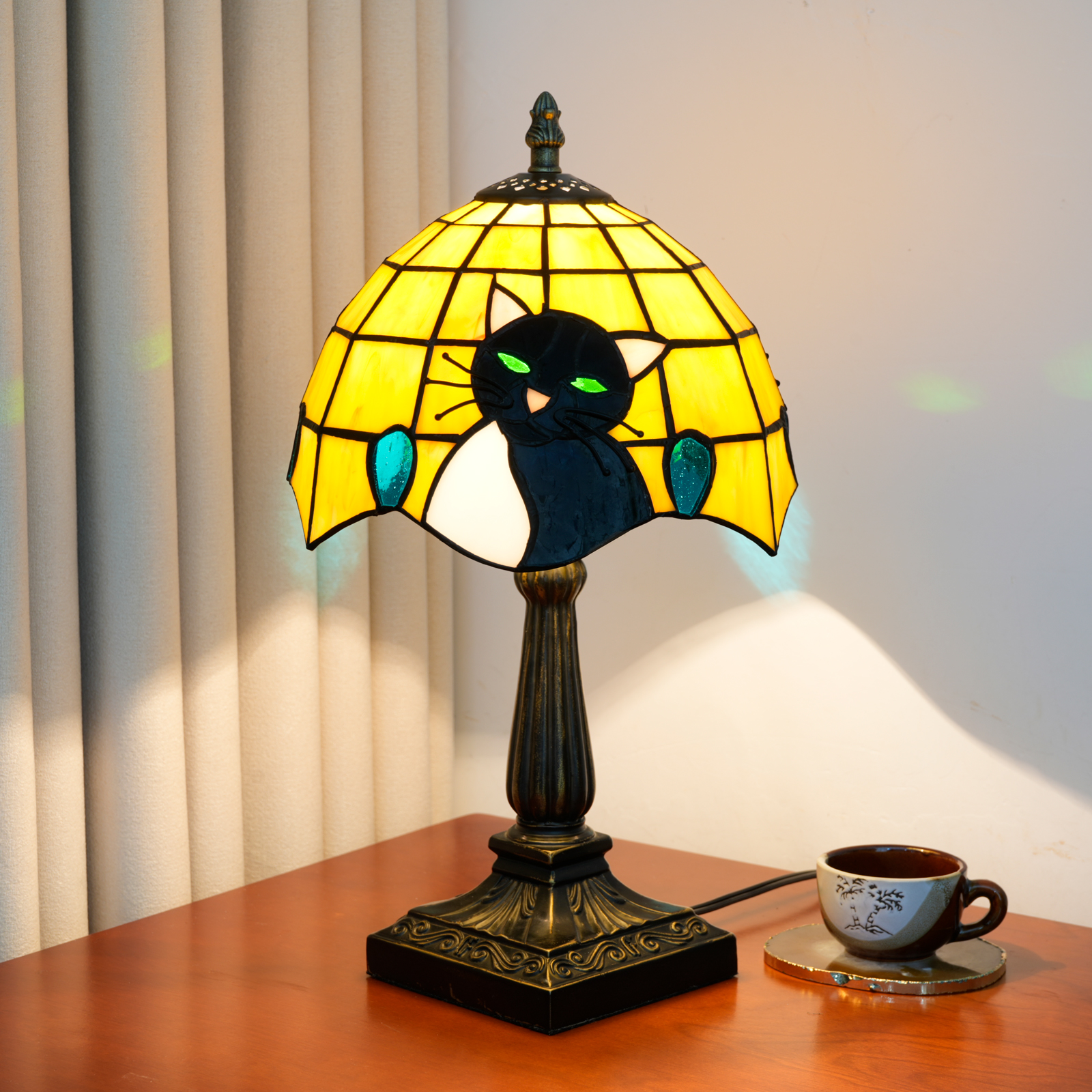 Blivuself Black Cat Tiffany Style Table Lamp, 8 Inch Yellow Stained Glass Shade With Antique Bronze Base, Suitable For Bedroom Sitting Room Dining-Room Warmth Household Atmosphere<OFU1414>