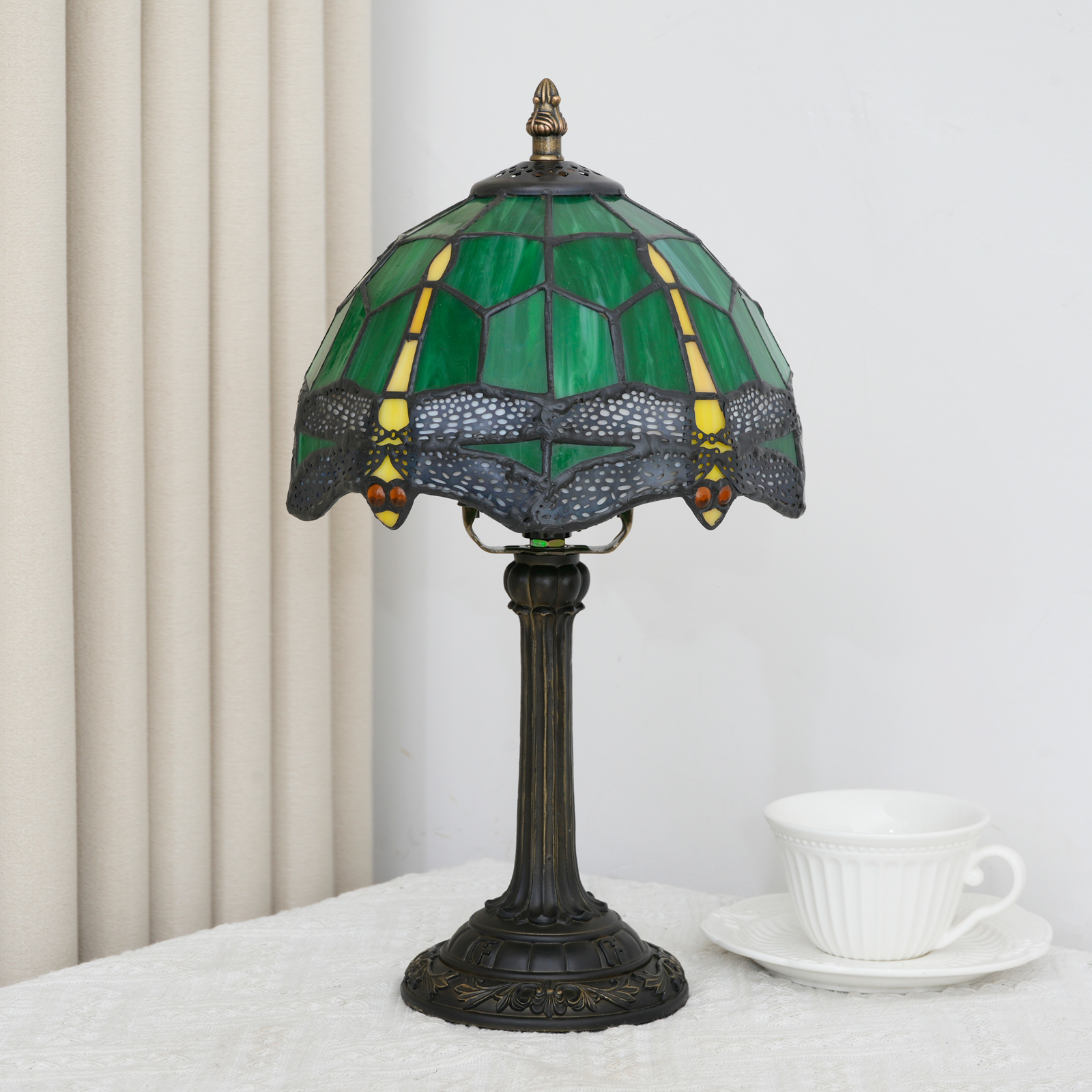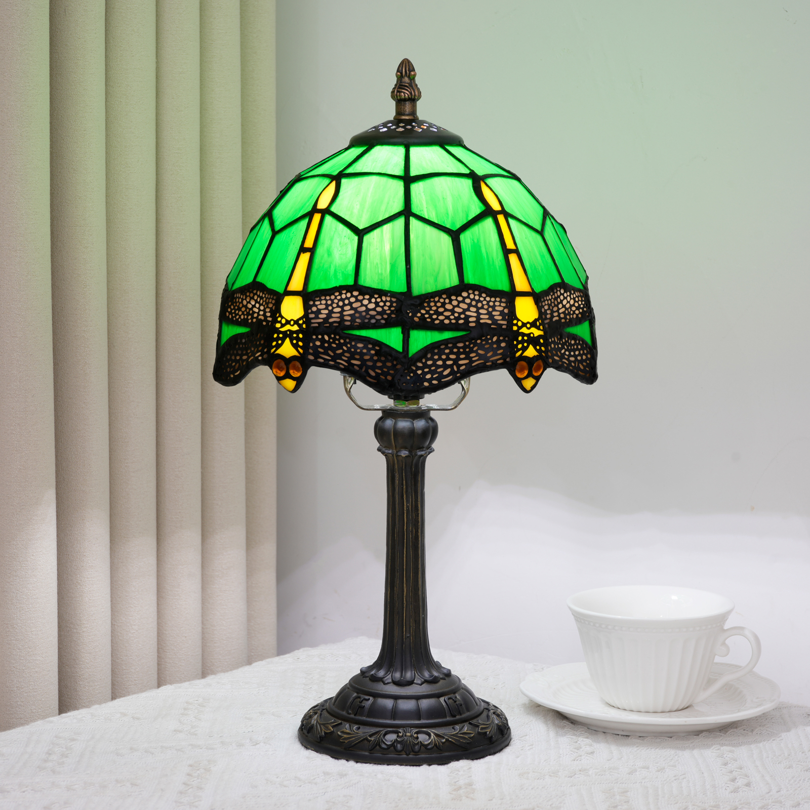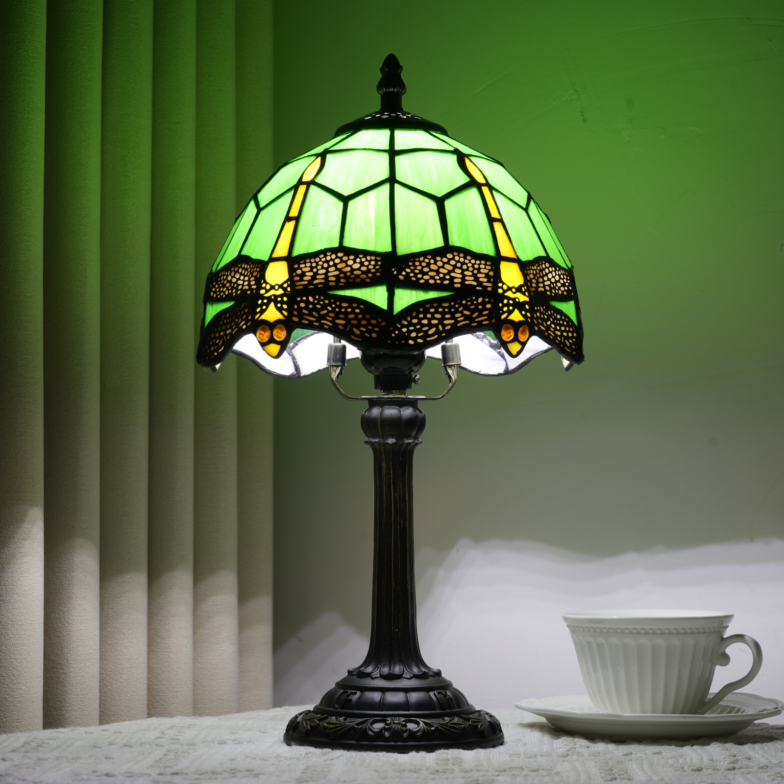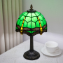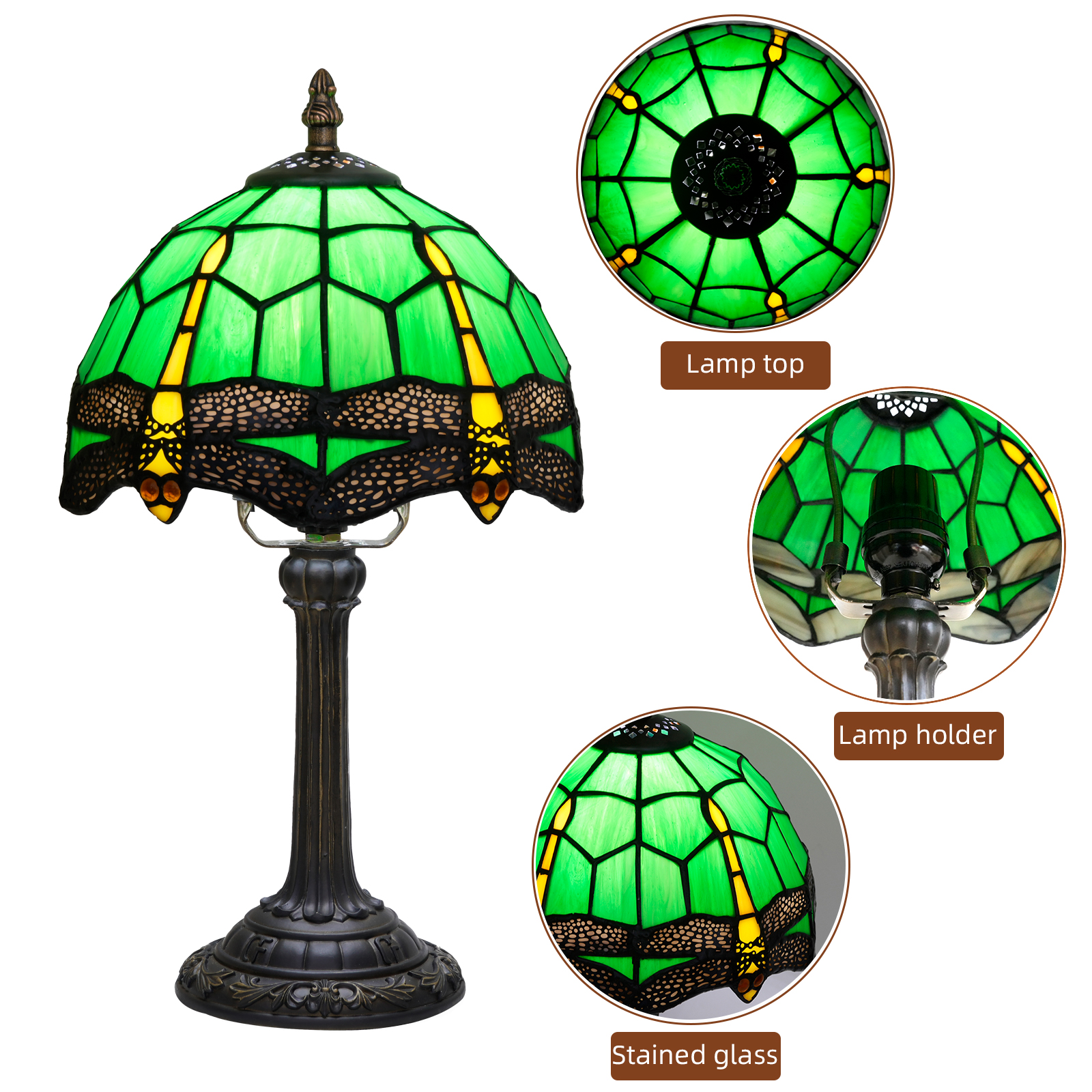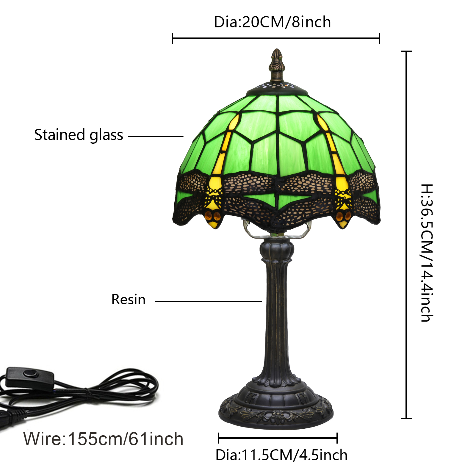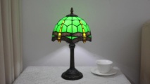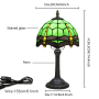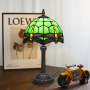This Tiffany style table lamp features an 8-inch (20CM in diameter) lampshade crafted with classic colored glass techniques, presenting a dynamic dragonfly pattern. With a green main tone and yellow and red details, it is both retro and lively. The lamp is 36.5CM tall. The lamp body and base are made of resin and have been carved. The patterns are exquisite, stable and artistic.