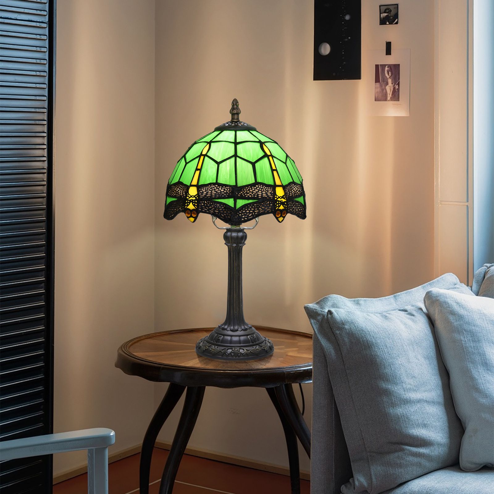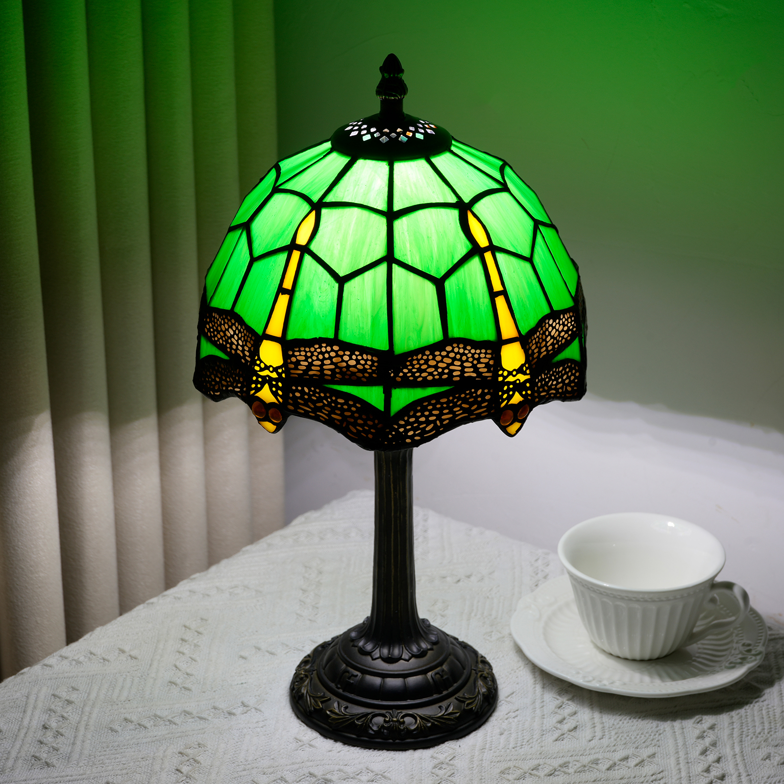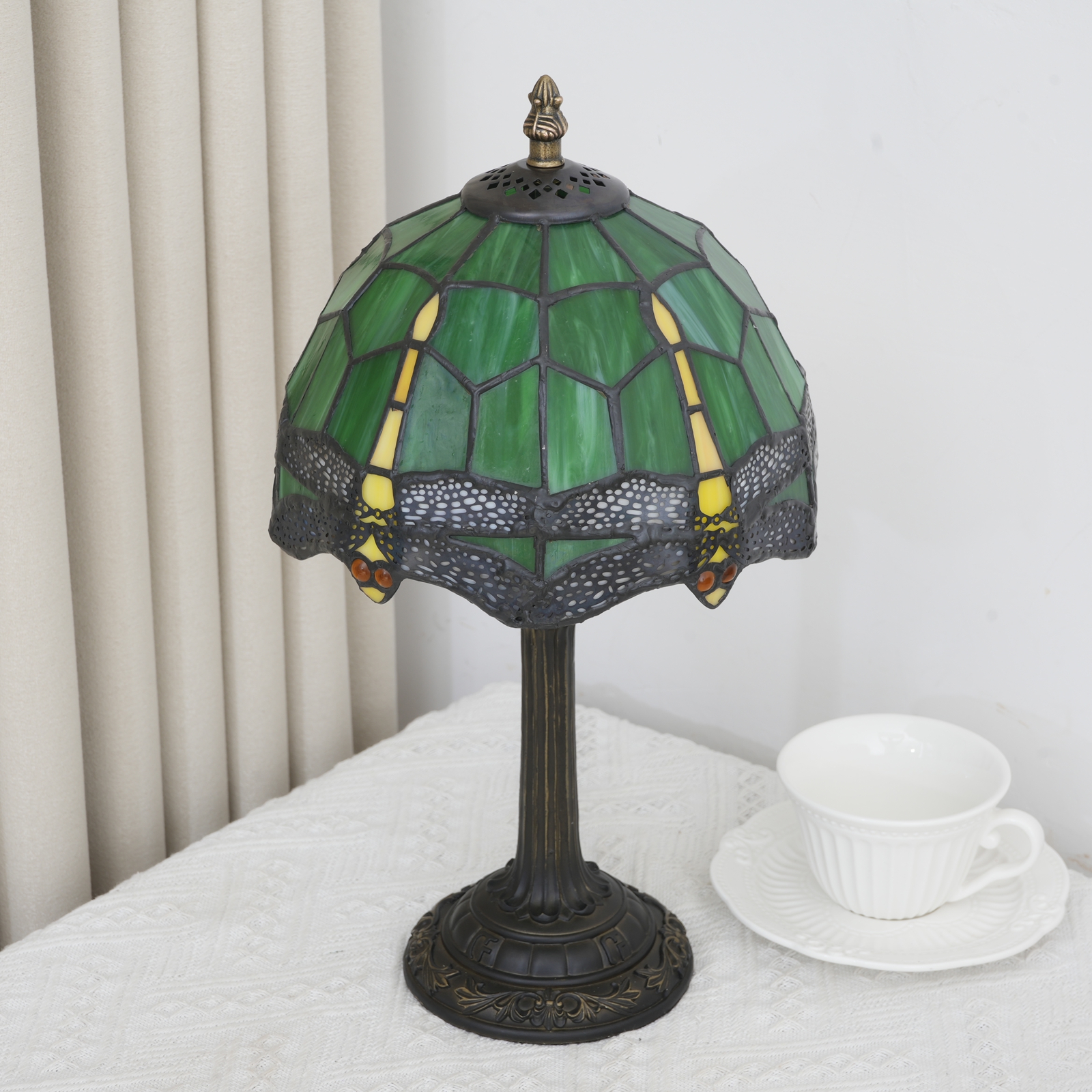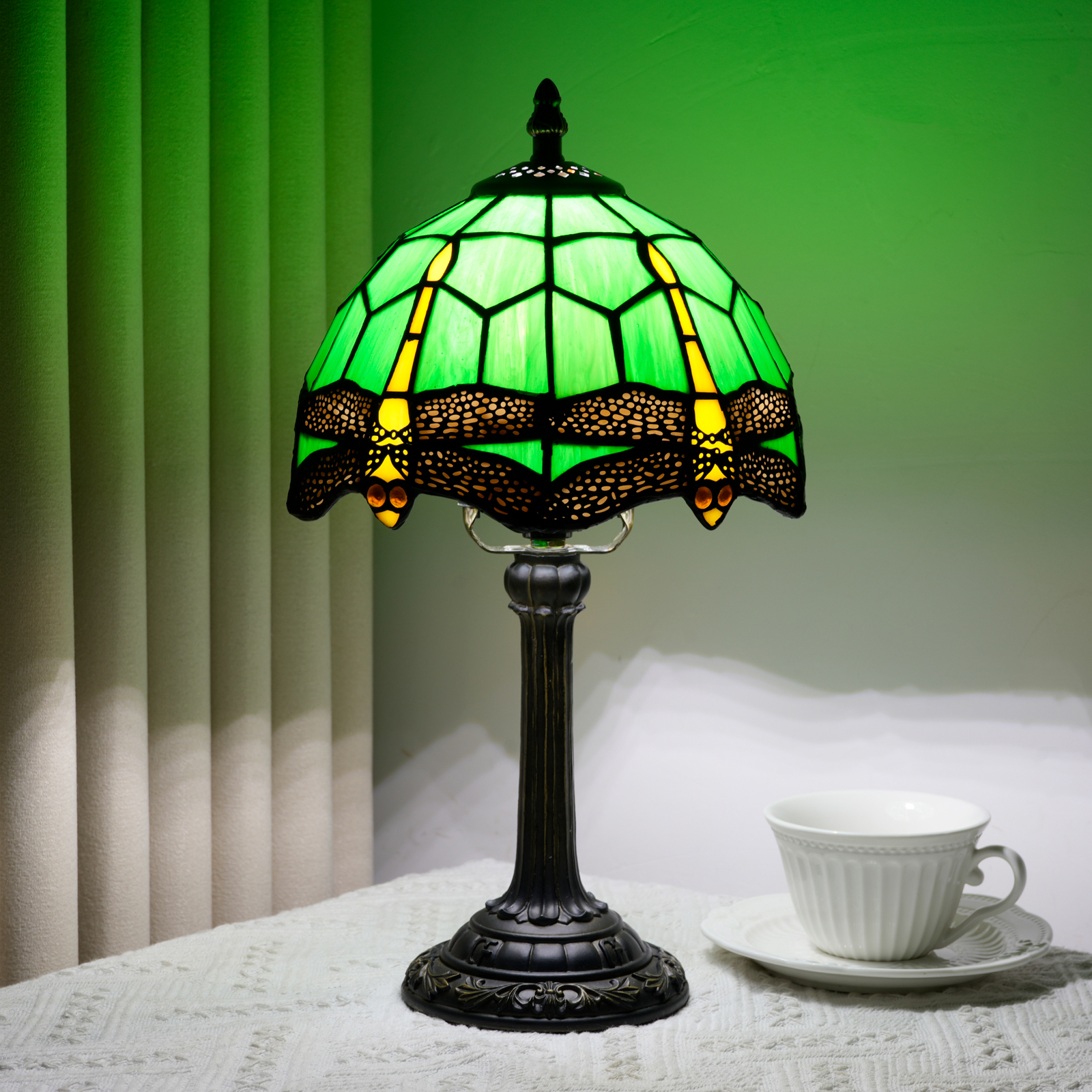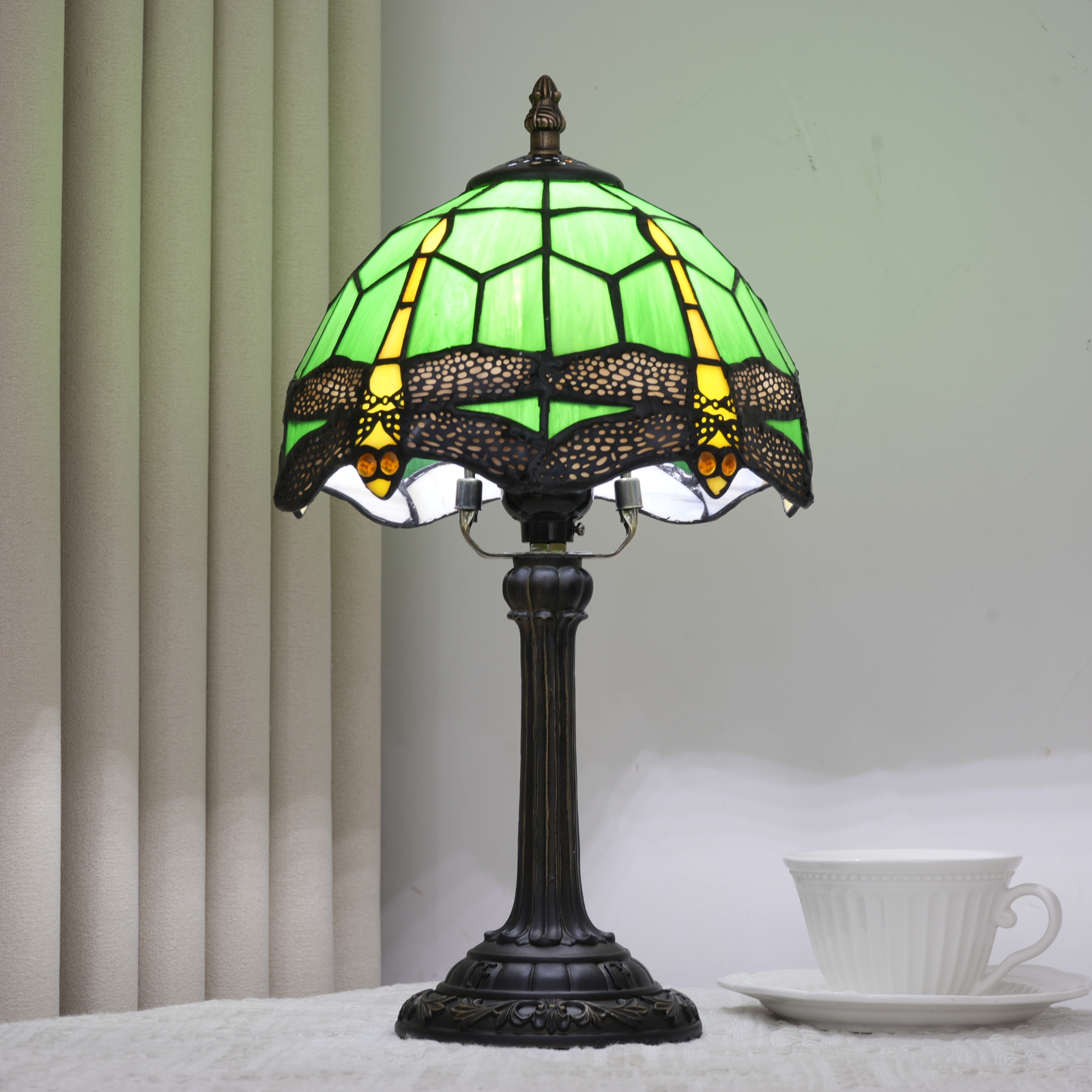 This Tiffany style table lamp features an 8-inch (20CM in diameter) lampshade crafted with classic colored glass techniques, presenting a dynamic dragonfly pattern. With a green main tone and yellow and red details, it is both retro and lively. The lamp is 36.5CM tall. The lamp body and base are made of resin and have been carved. The patterns are exquisite, stable and artistic.